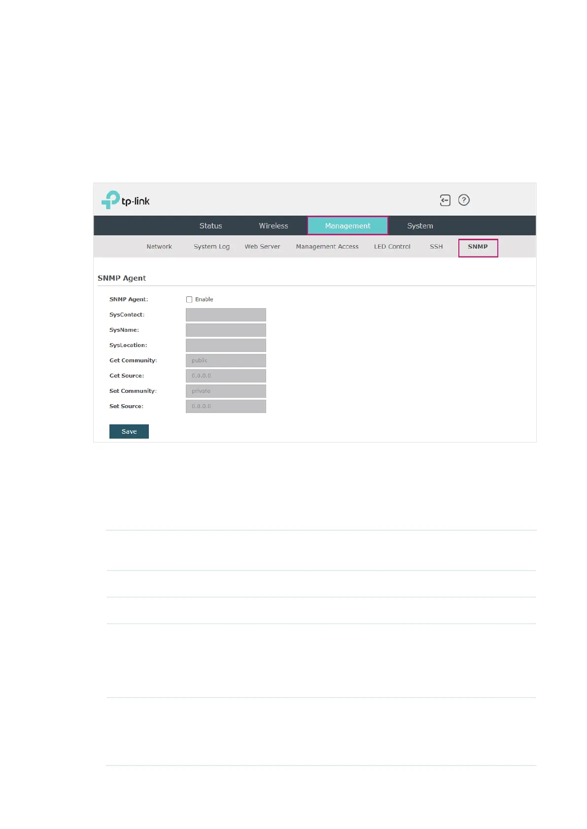 To configure the EAP as an SNMP agent, go to the Management > SNMP page.
