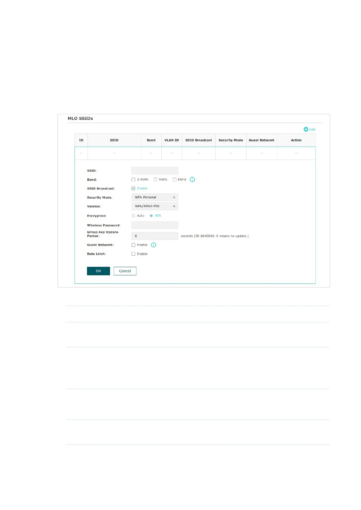 To configure an MLO network, go to Wireless > Wireless Settings > MLO and click Add.