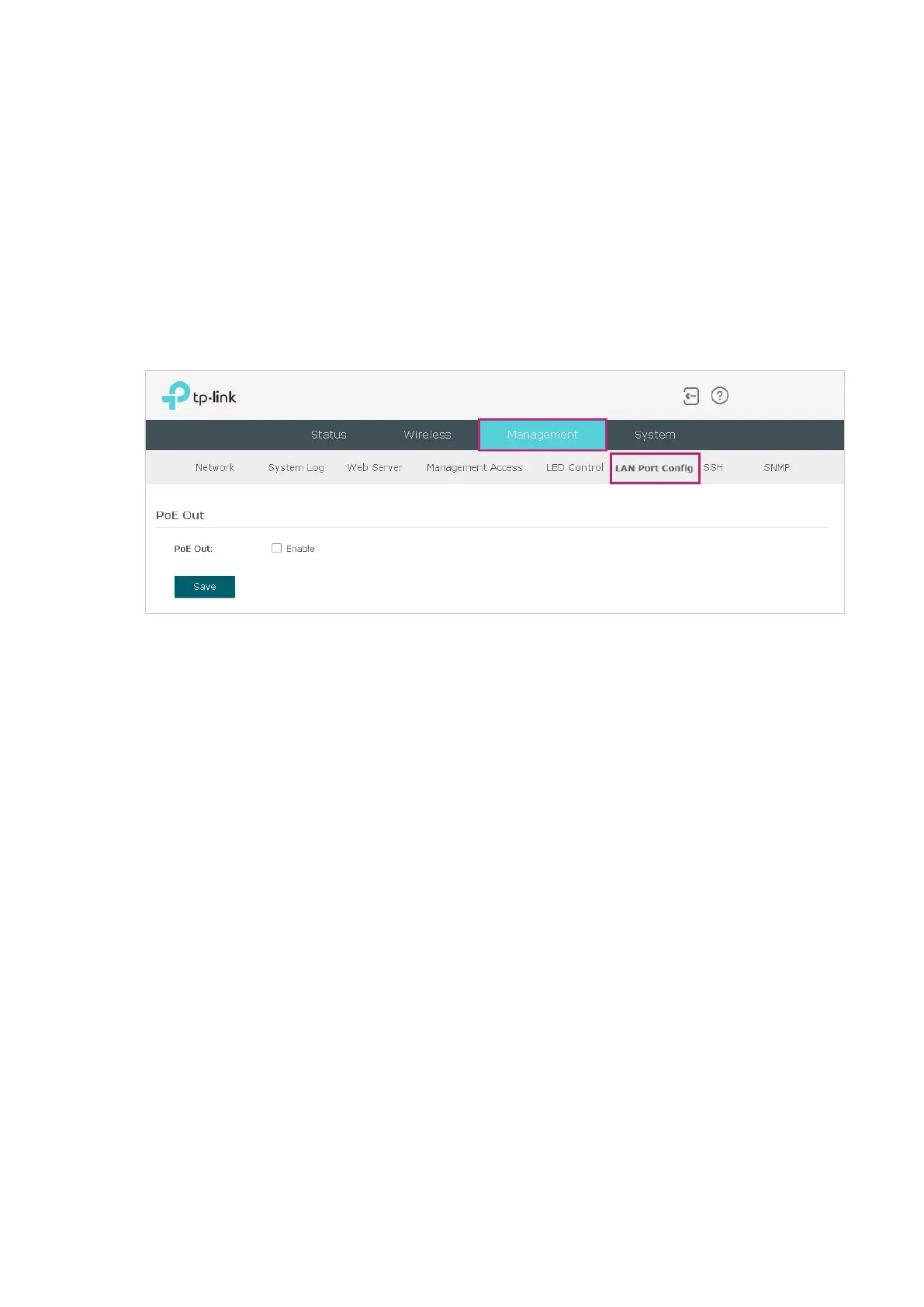 To configure PoE Out, go to the Management > LAN Port Config page.