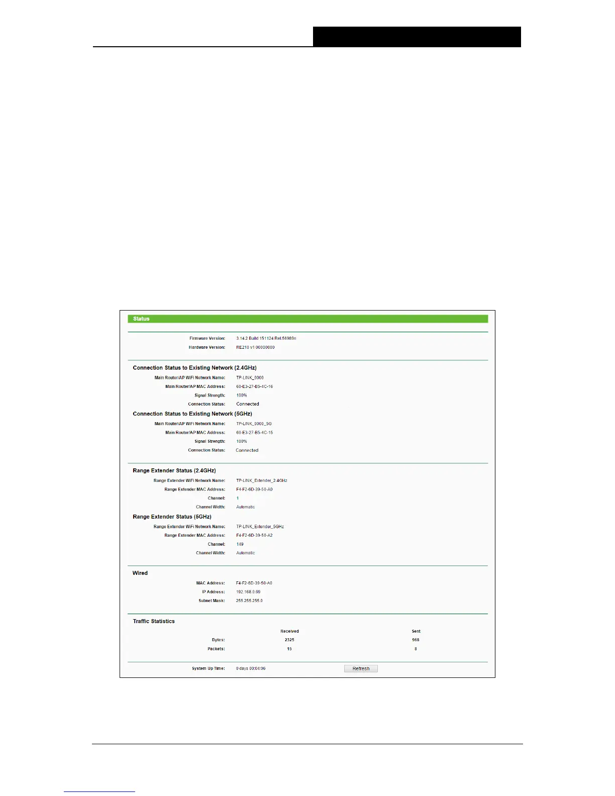 Selecting Status will enable you to view the Range Extender’s current status and configuration, all