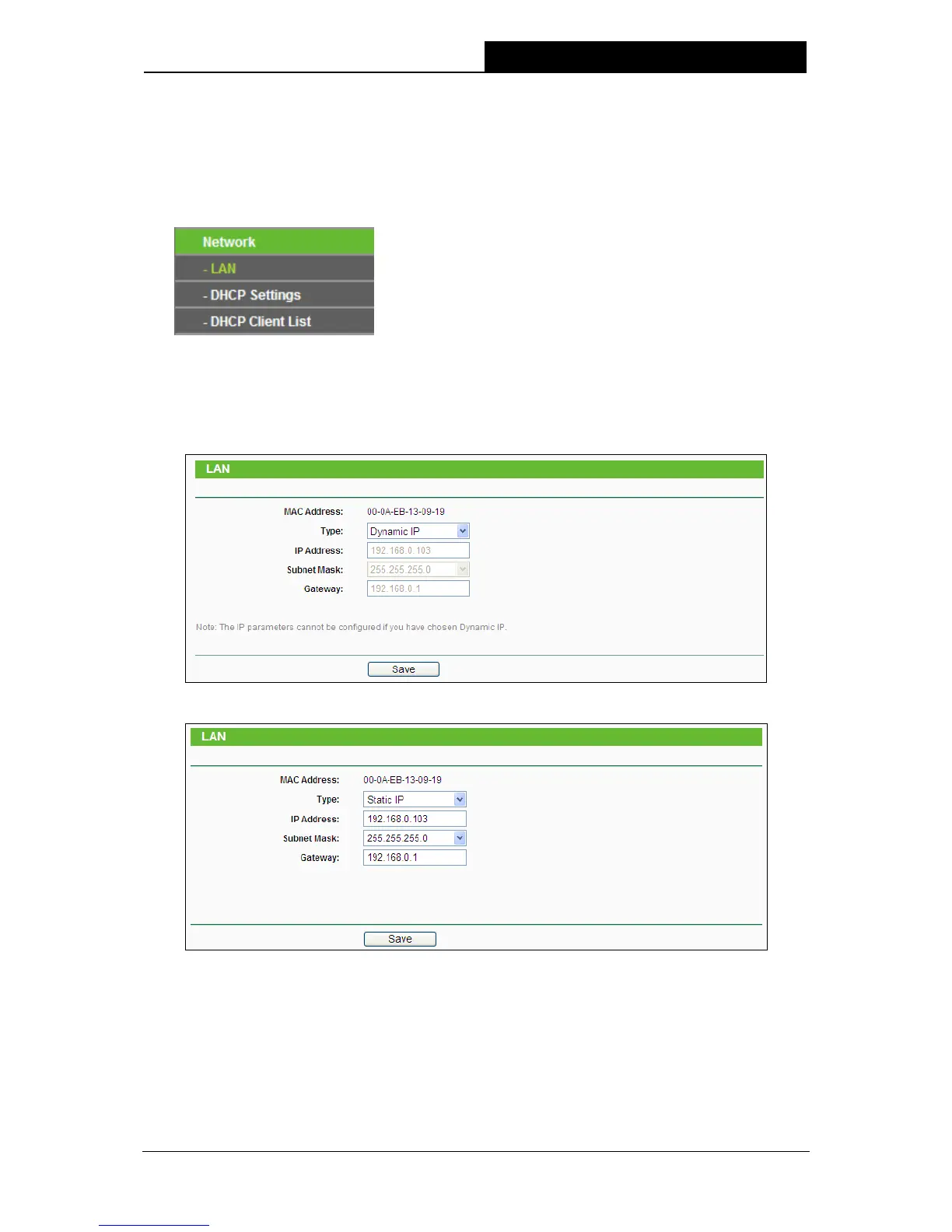 Selecting Network > LAN will enable you to configure the IP parameters of Network on this page.