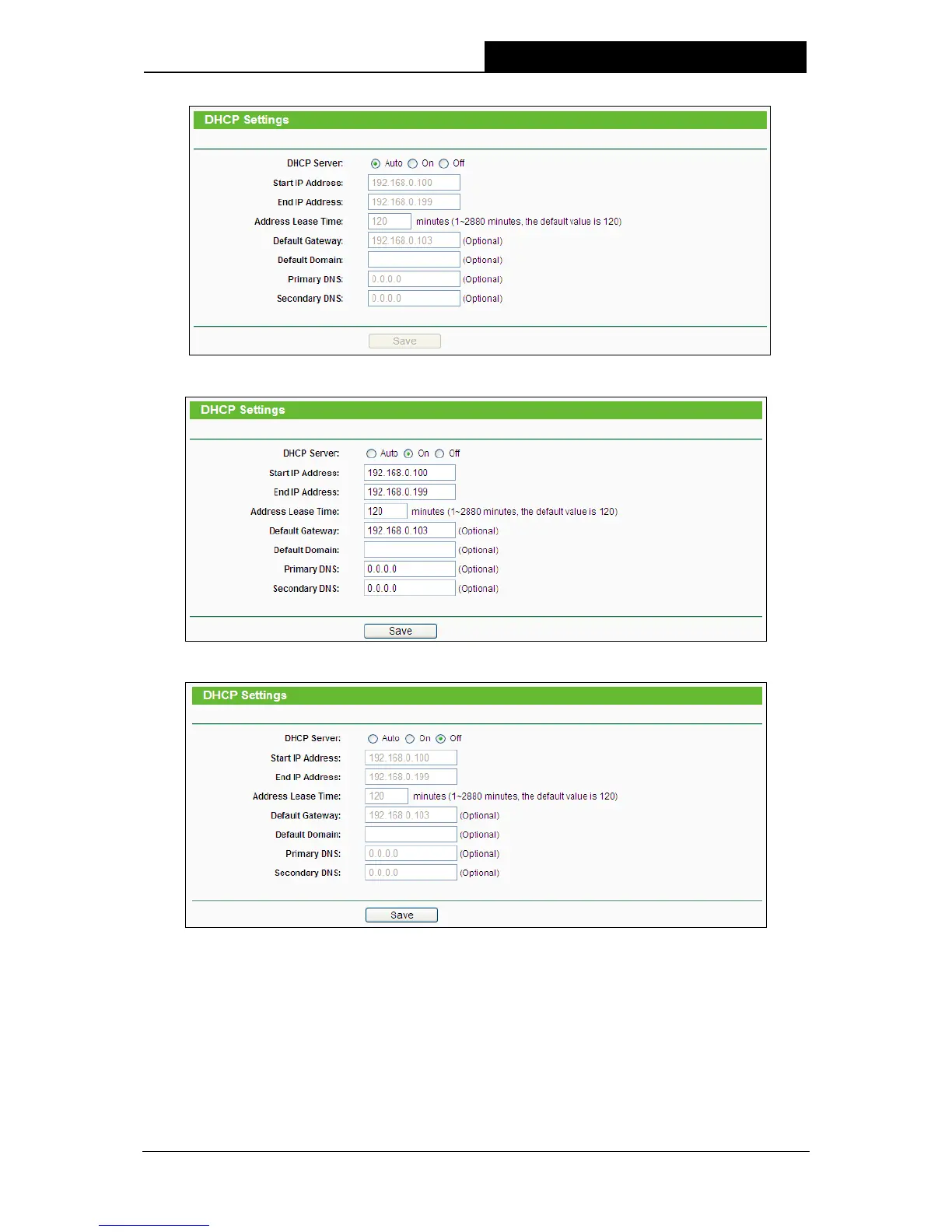 DHCP Server - Selecting the radio button before Auto/On/Off will disable/enable the DHCP