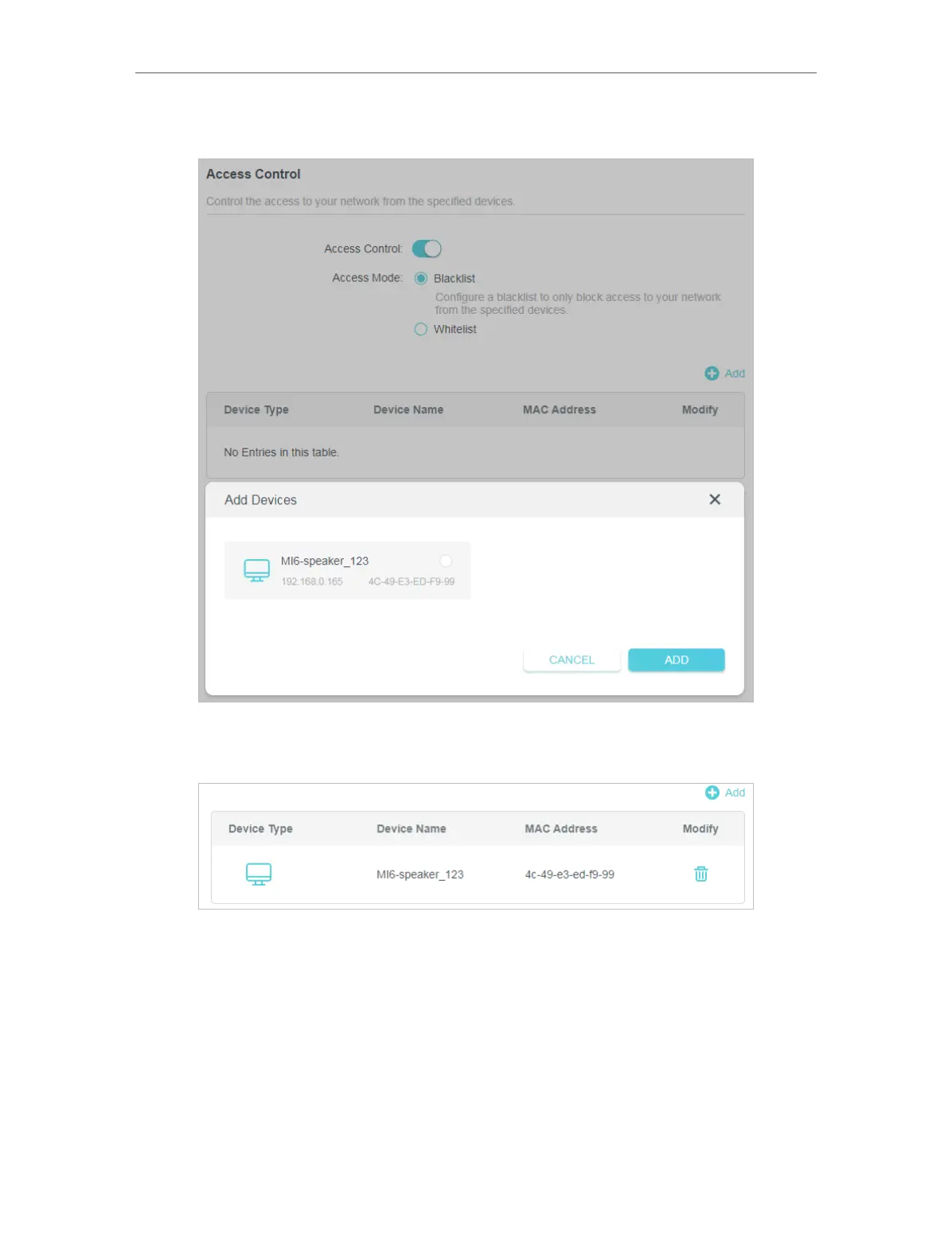 3. Click ADD and the selected device(s) will be added to the Devices in Blacklist table.