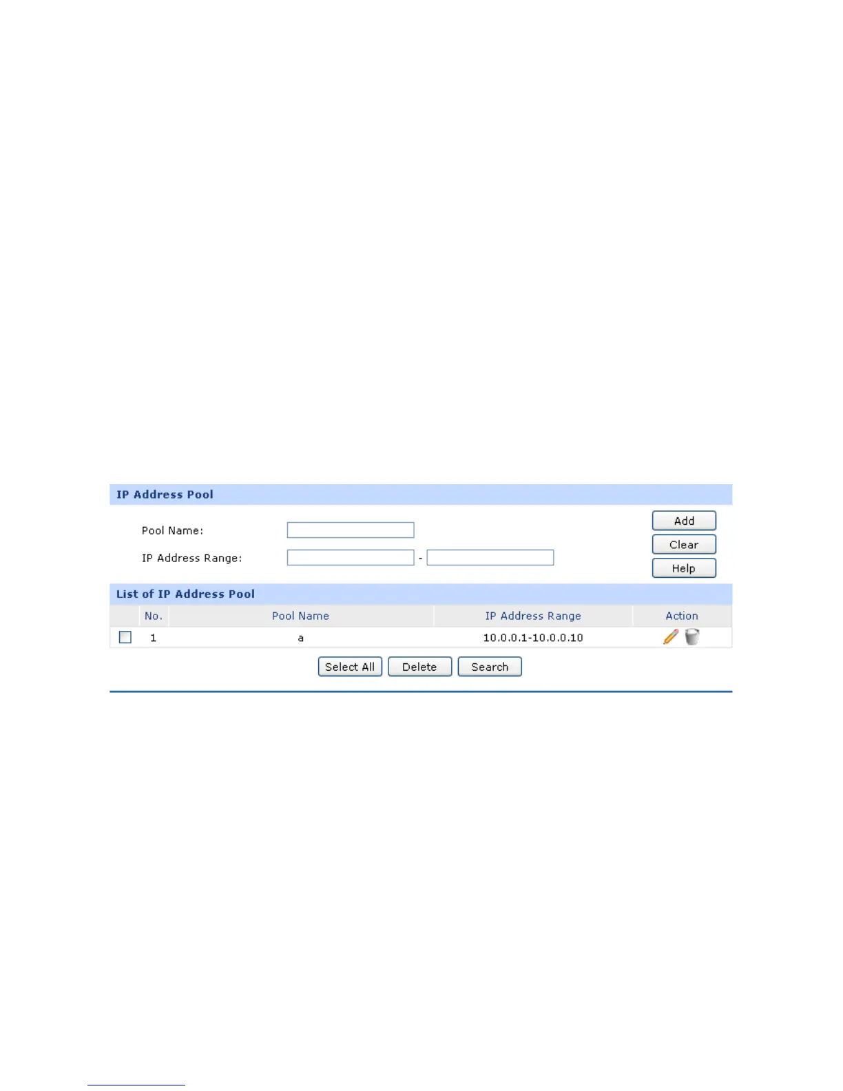 Choose the menu VPN→L2TP/PPTP→IP Address Pool to load the following page.
