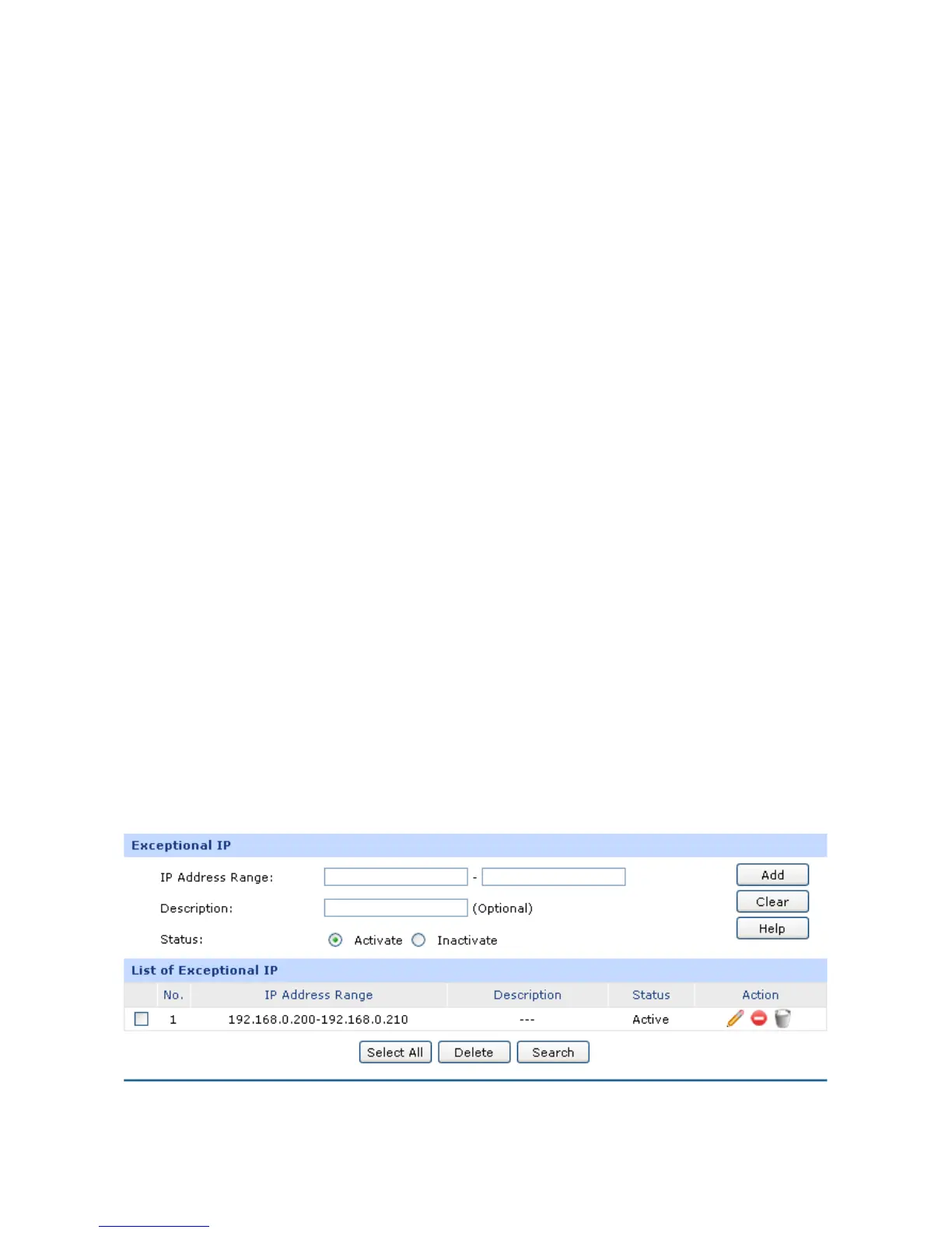 Exceptional IP can access the Internet. On this page, you can specify the Exceptional IP.