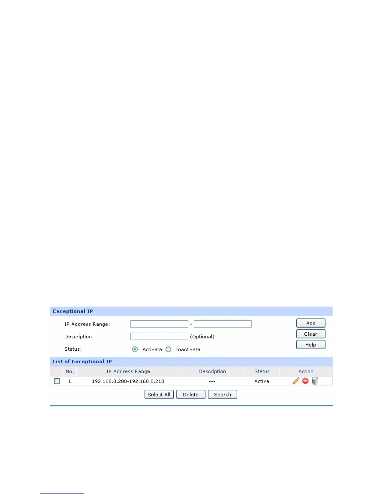 Exceptional IP can access the Internet. On this page, you can specify the Exceptional IP.