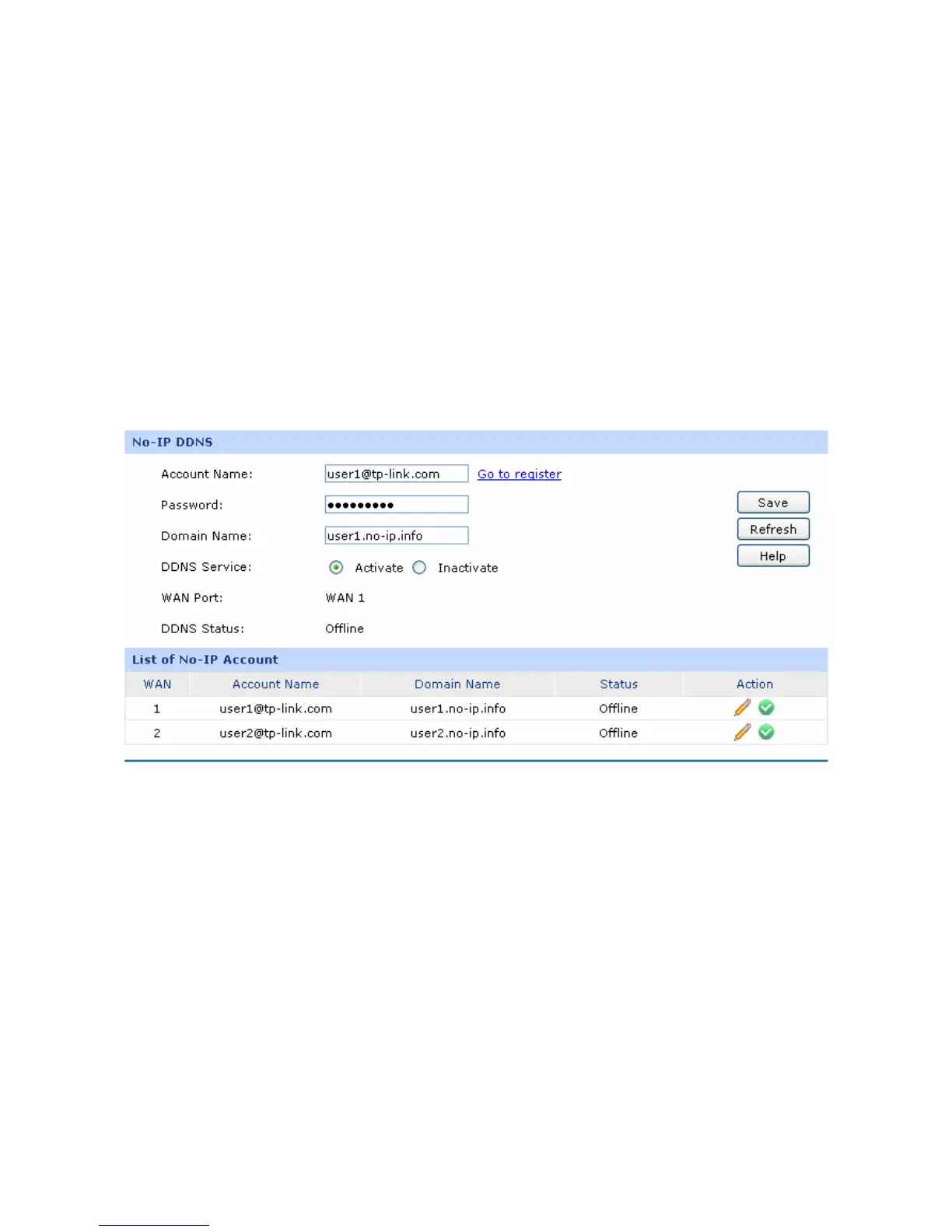 Choose the menu Services→Dynamic DNS→No-IP to load the following page.