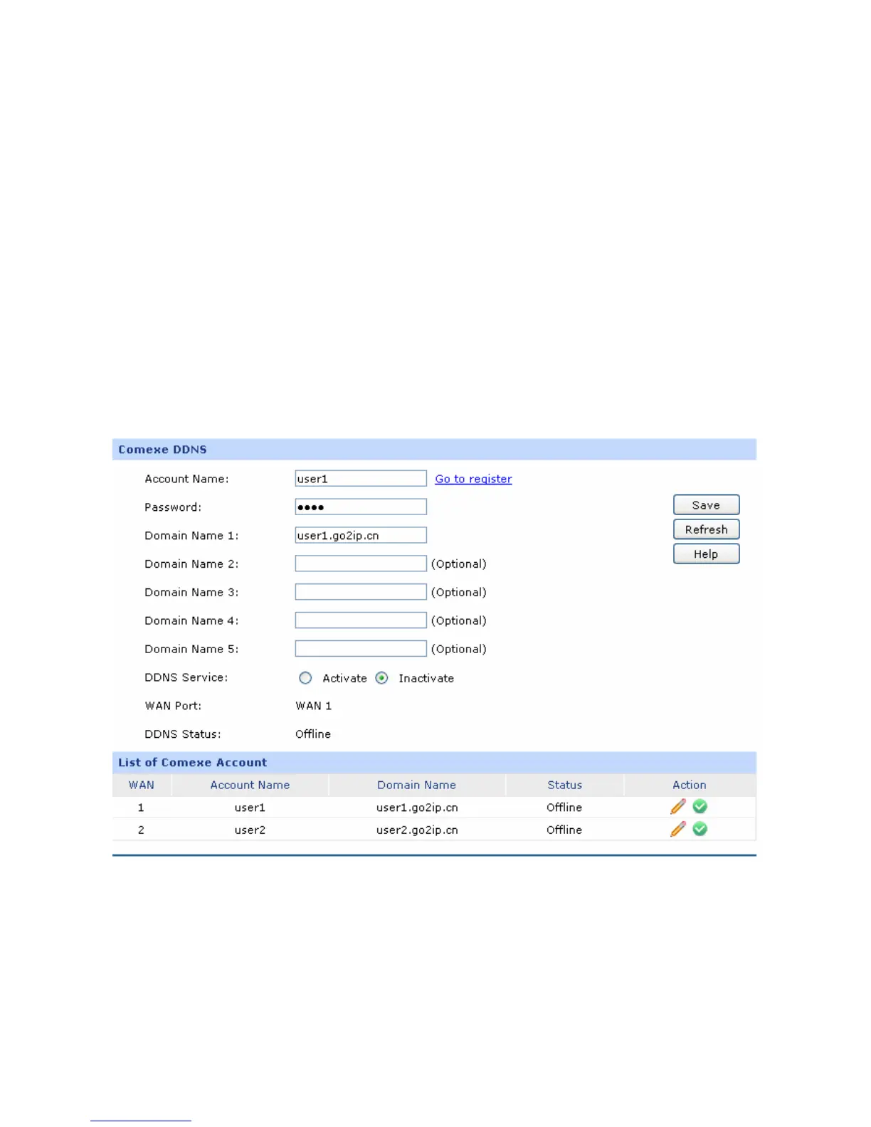 Choose the menu Services→Dynamic DNS→Comexe to load the following page.