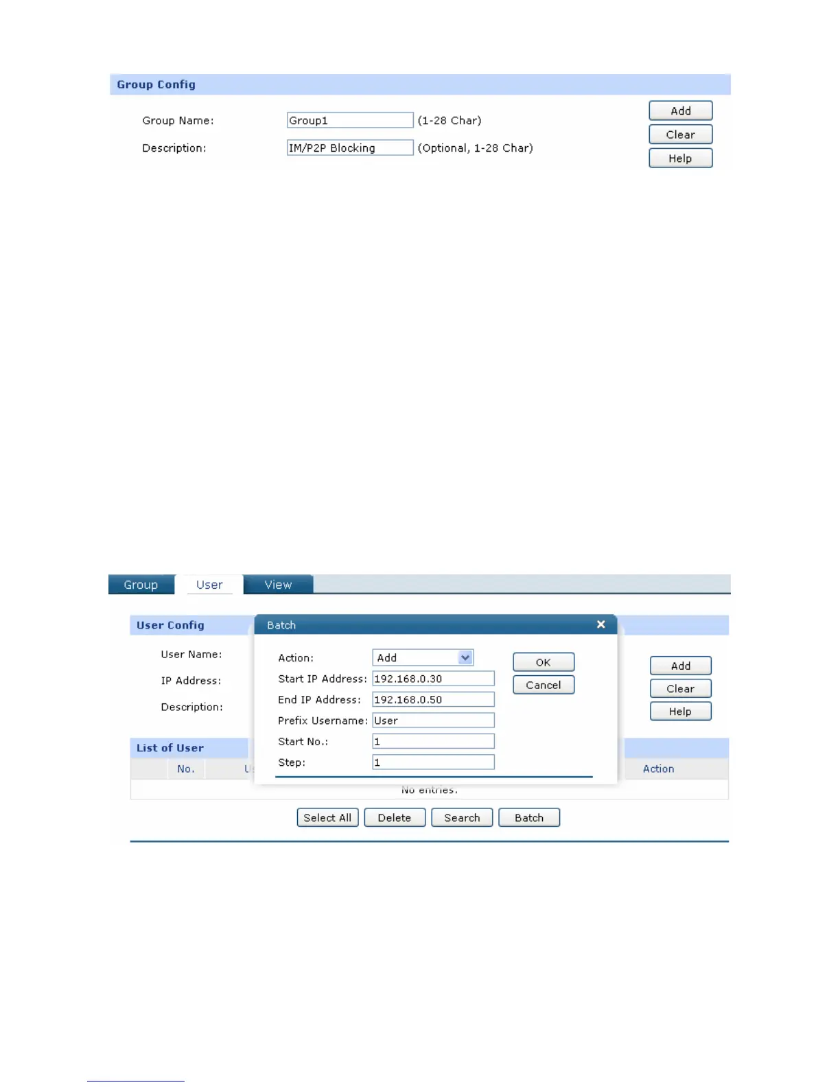 Choose the menu User Group→User to load the configuration page. Click the <Batch> button to