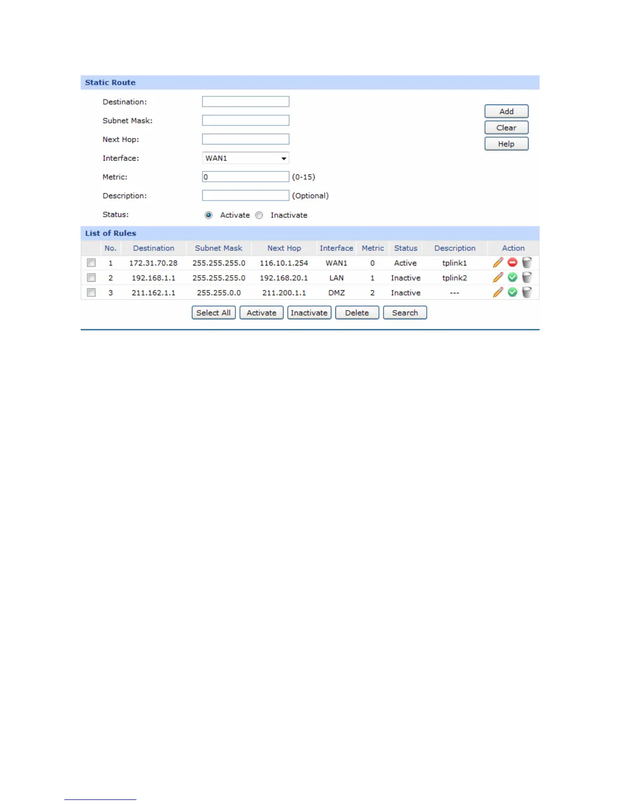 Choose the menu Advanced→Routing→Static Route to load the following page.