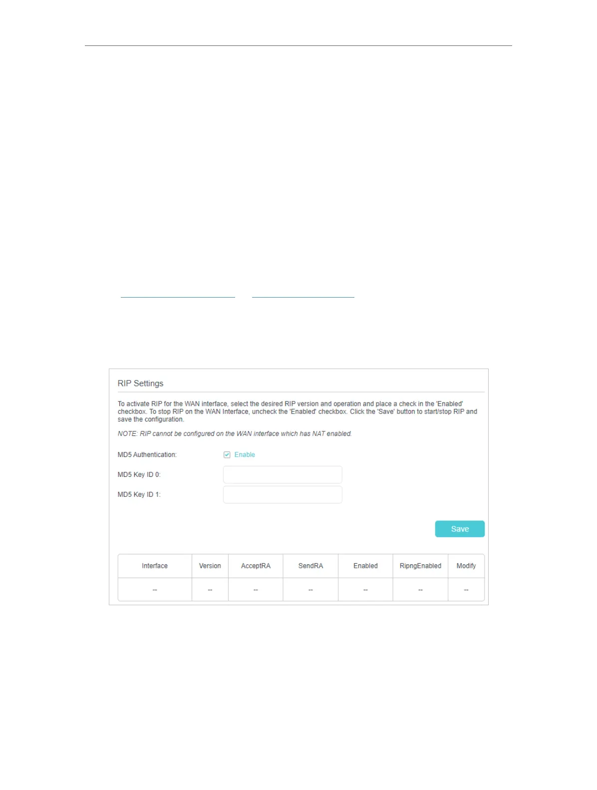 • MD5 Authentication - Enable MD5 Authentication to enhance the rip RA packets