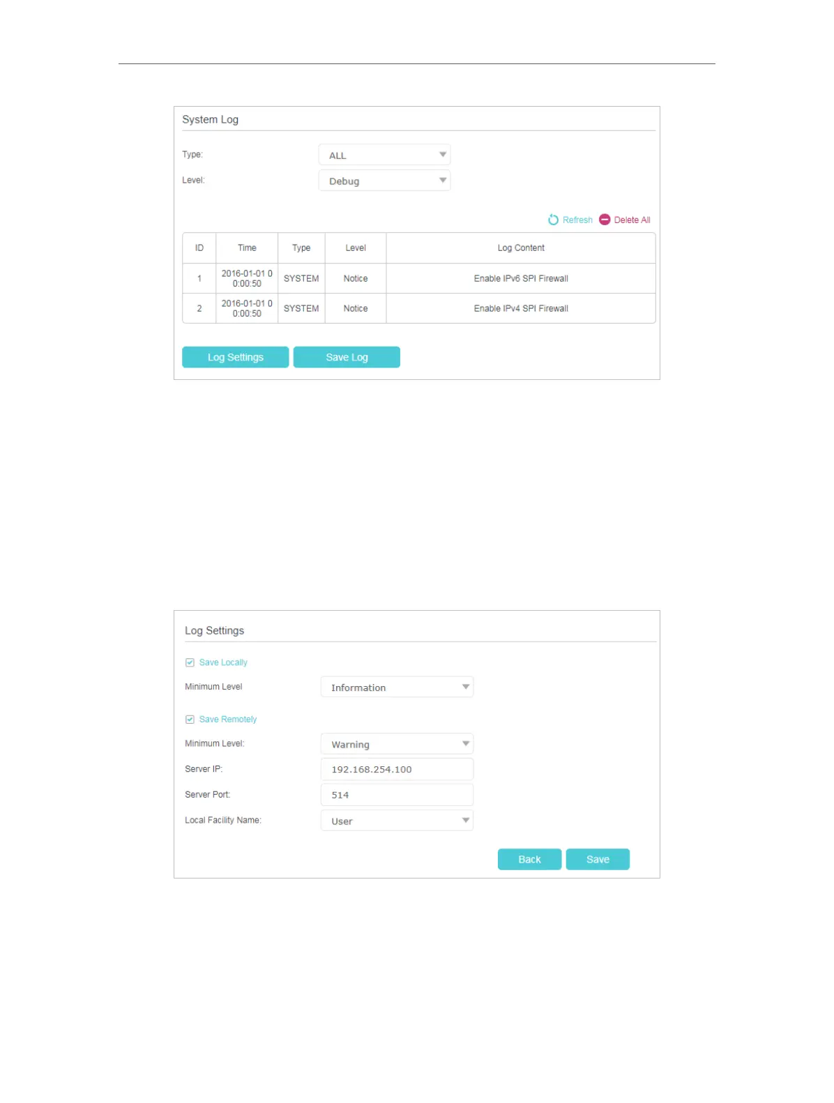 • Save Locally: Select this option to cache the system log to the router’s local memory,