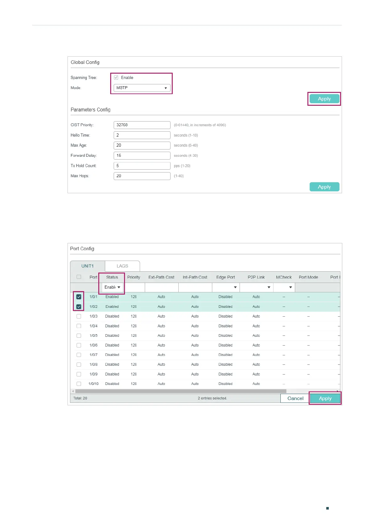 the following page. Enable spanning tree function on port 1/0/1 and port 1/0/2. Here we