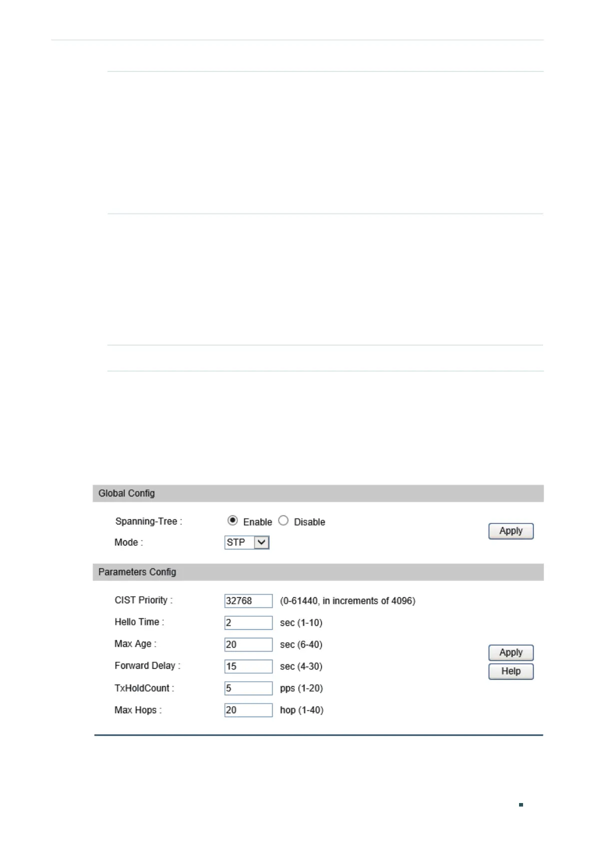 Choose the menu Spanning Tree > STP Config > STP Config to load the following page.