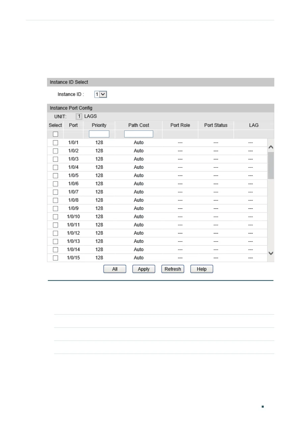 Choose the menu Spanning Tree > MSTP Instance > Instance Port Config to load the