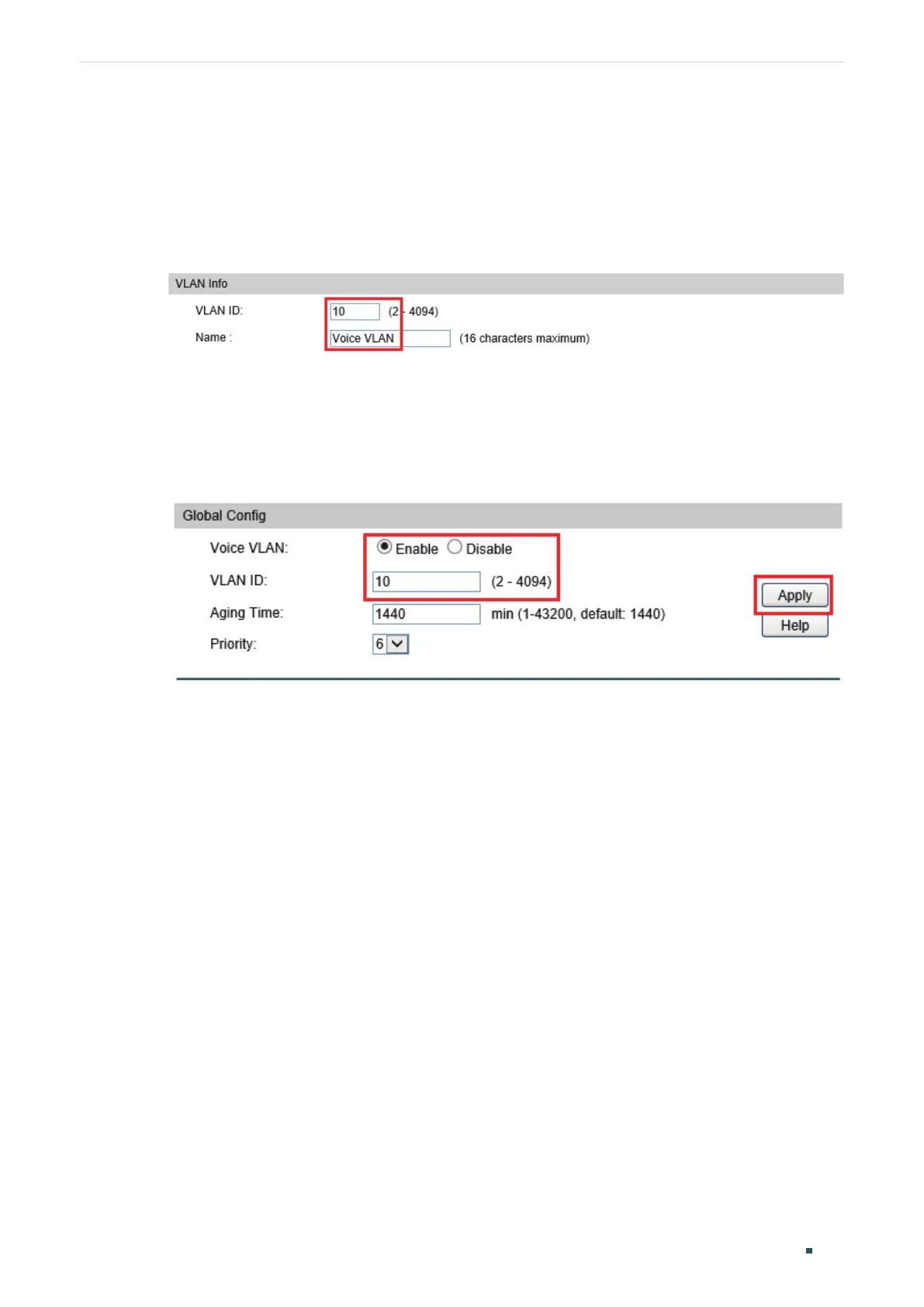 Choose the menu QoS > Voice VLAN > Global Config, enable Voice VLAN and set the