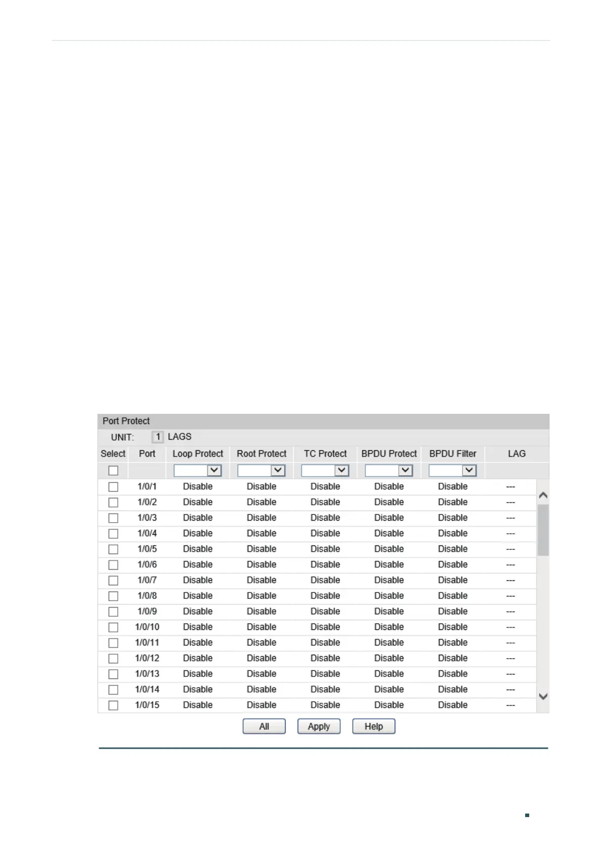 Choose the menu Spanning Tree > STP Security > Port Protect to load the following