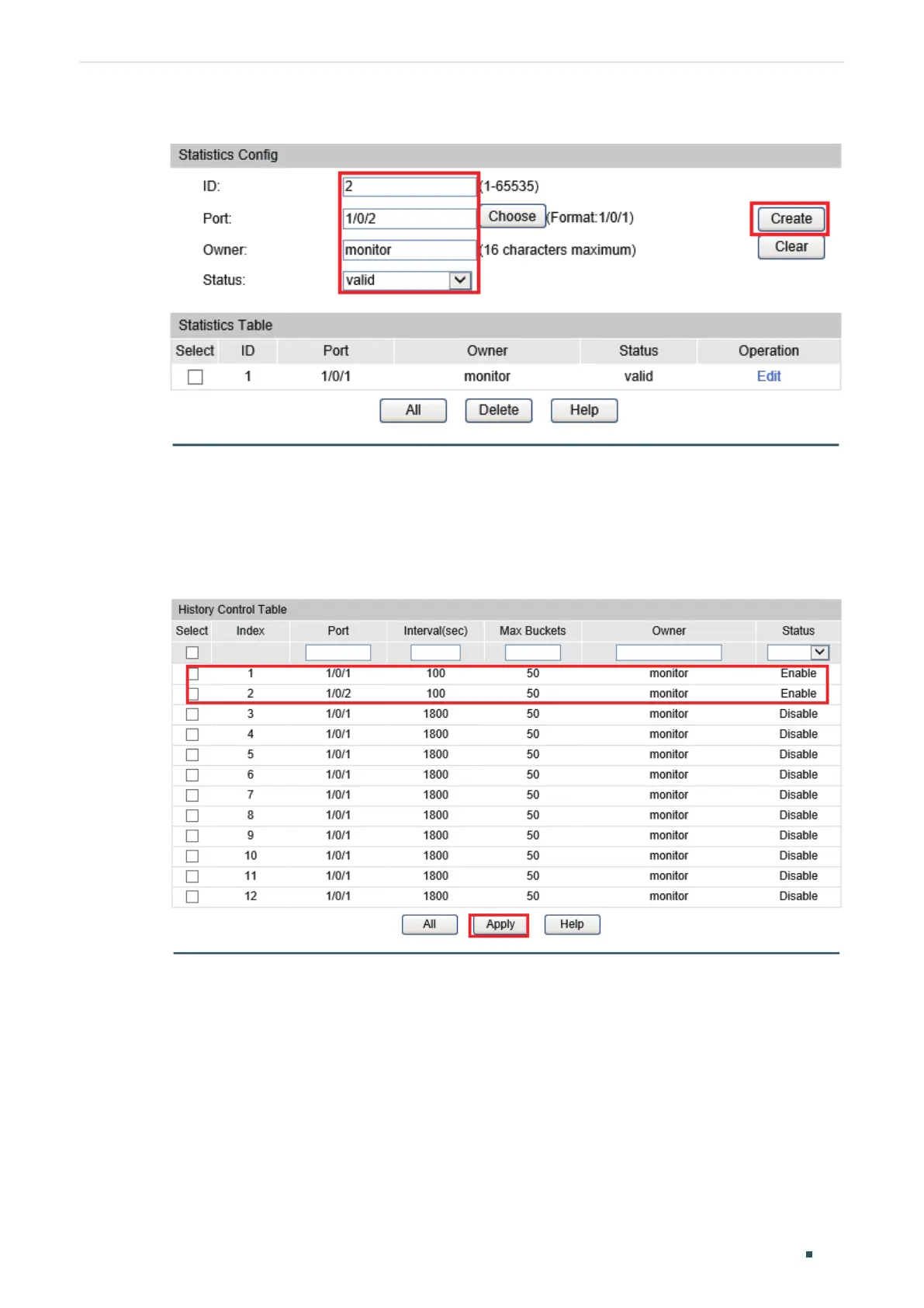 2)  Choose the menu SNMP > RMON > History to load the following page. Configure