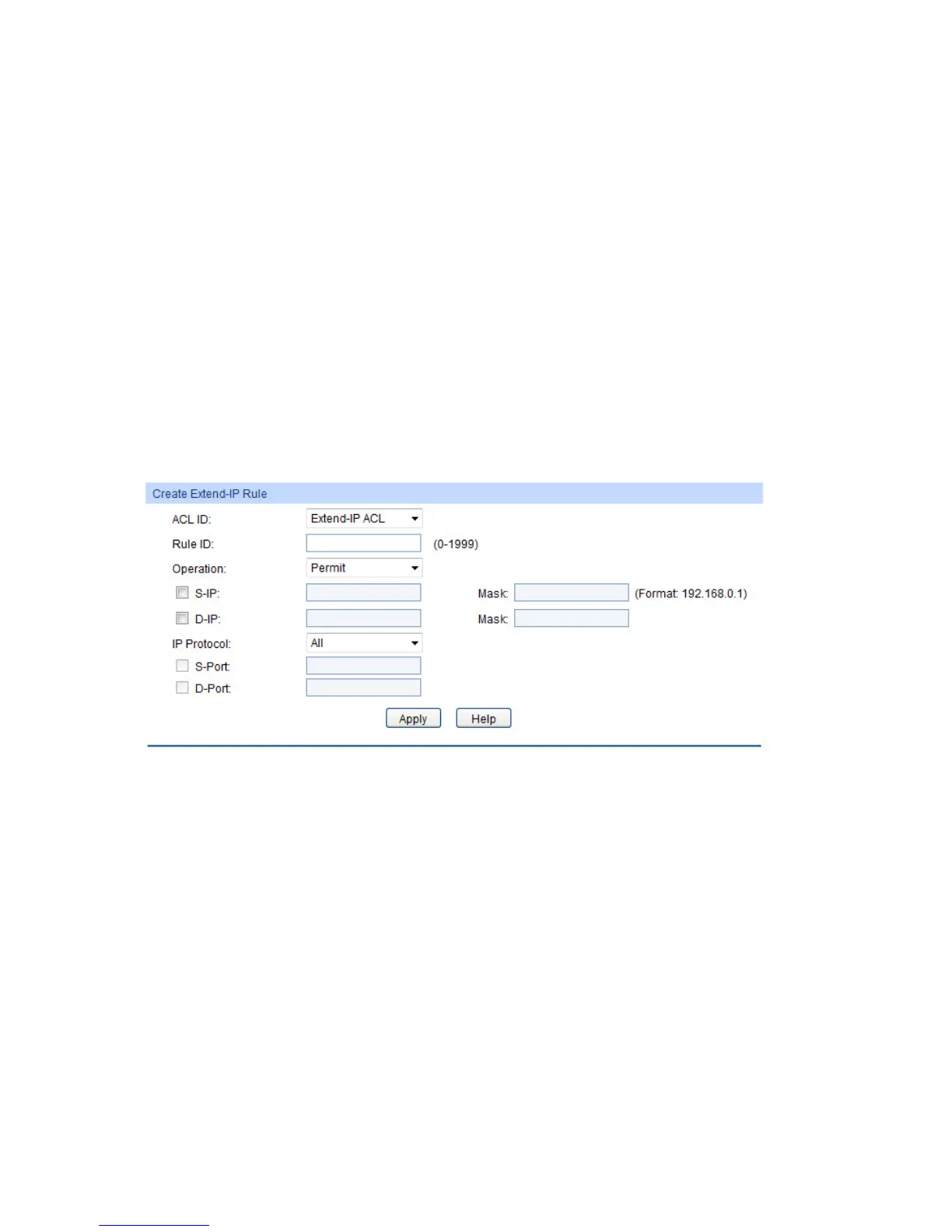 Choose the menu ACL→ACL Config→Extend-IP ACL to load the following page.