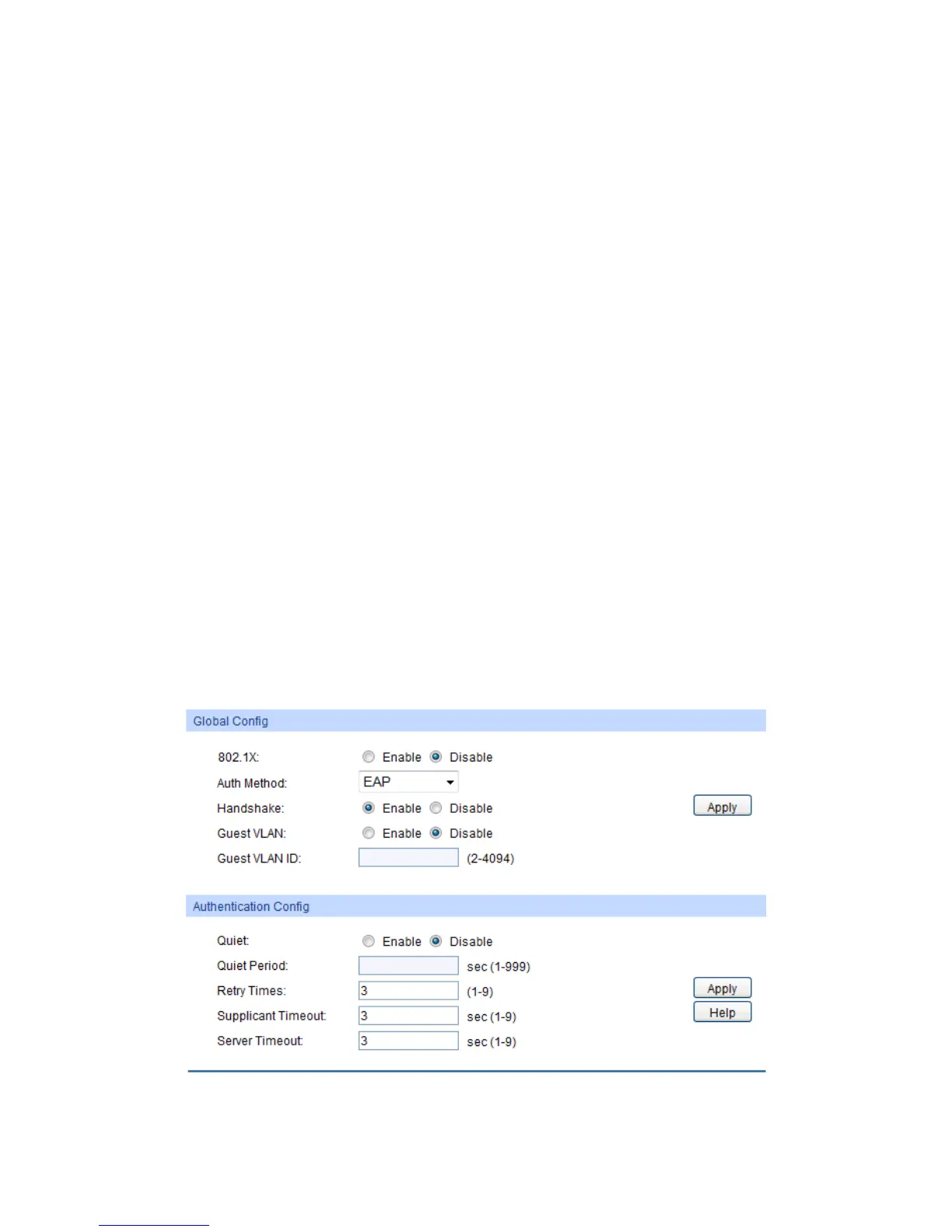 authentication process by specifying the Authentication Method, Guest VLAN and various Timers.