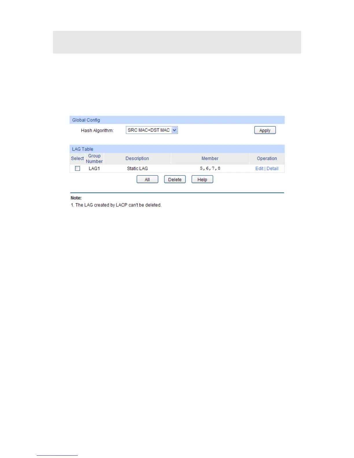 The LAG function is implemented on the LAG Table, Static LAG and LACP Config configuration