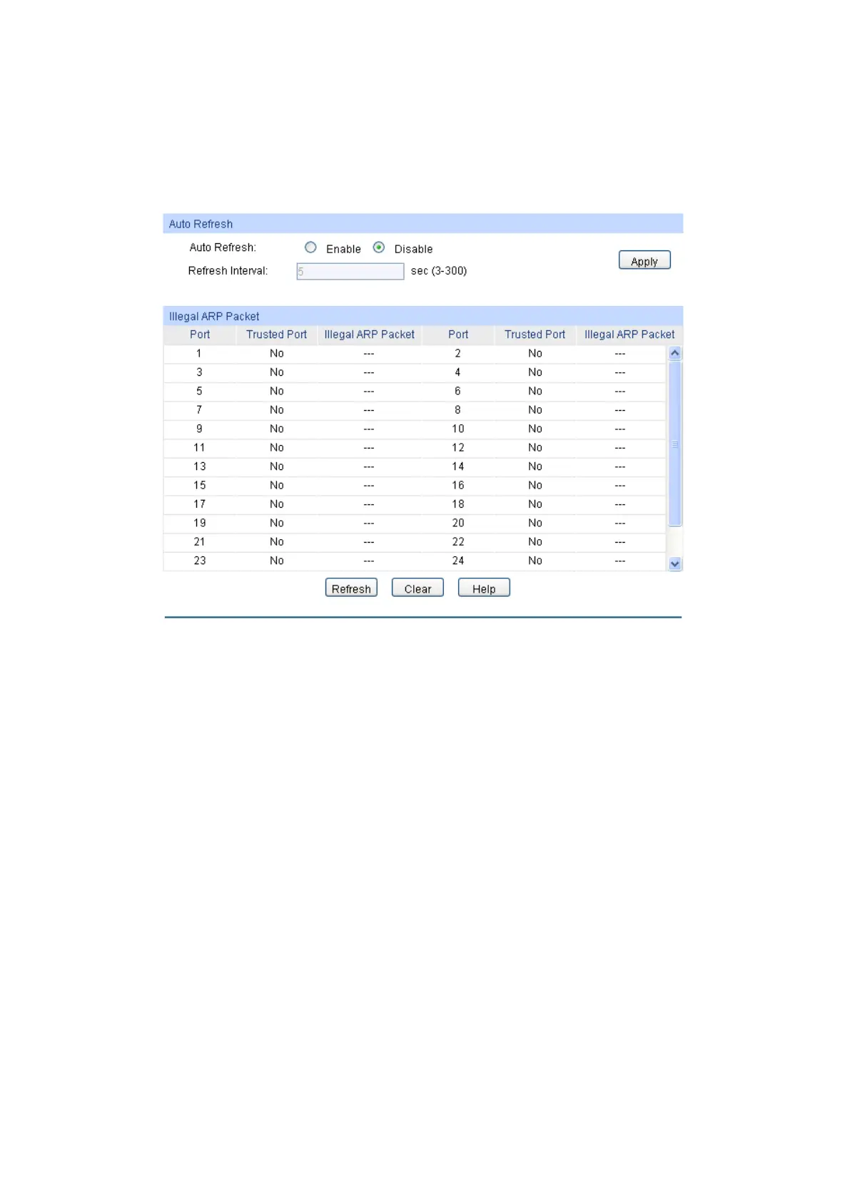 ARP Statistics feature displays the number of the illegal ARP packets received on each port, which
