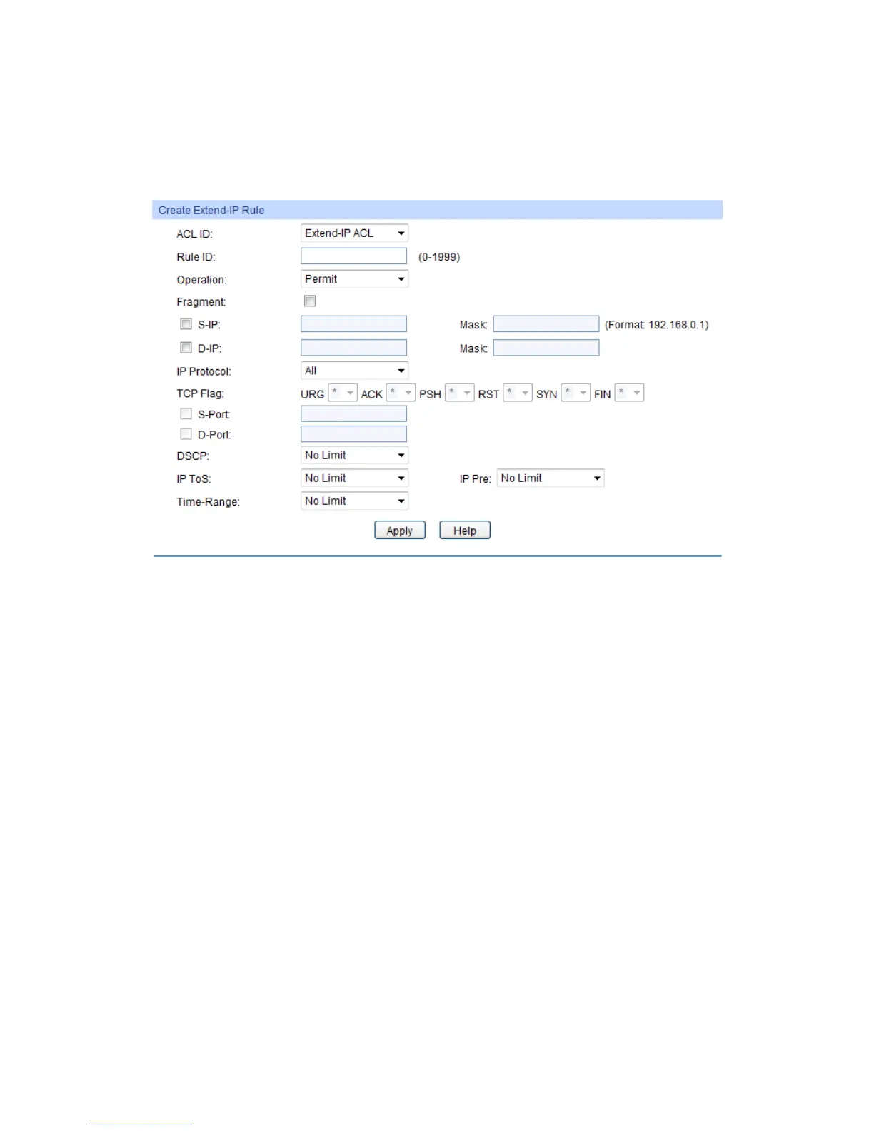 Choose the menu ACL→ACL Config→Extend-IP ACL to load the following page.
