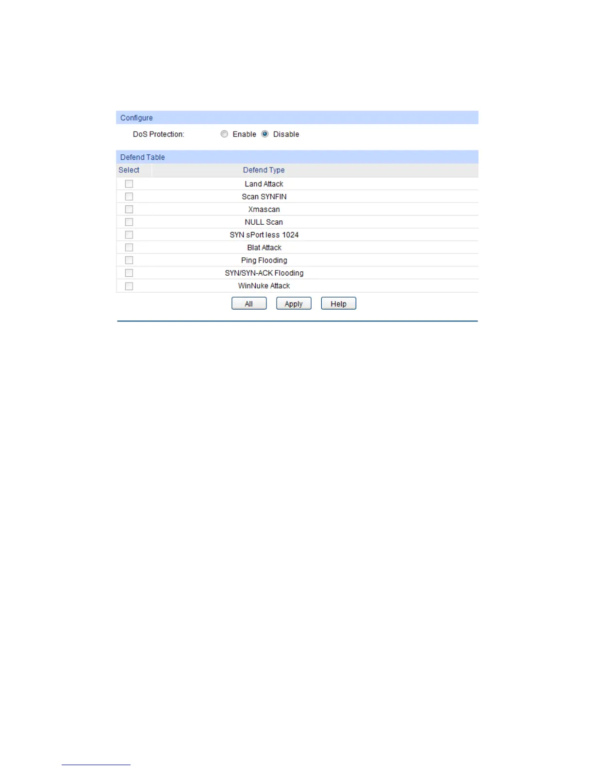 Allows you to Enable/Disable DoS Defend function.
