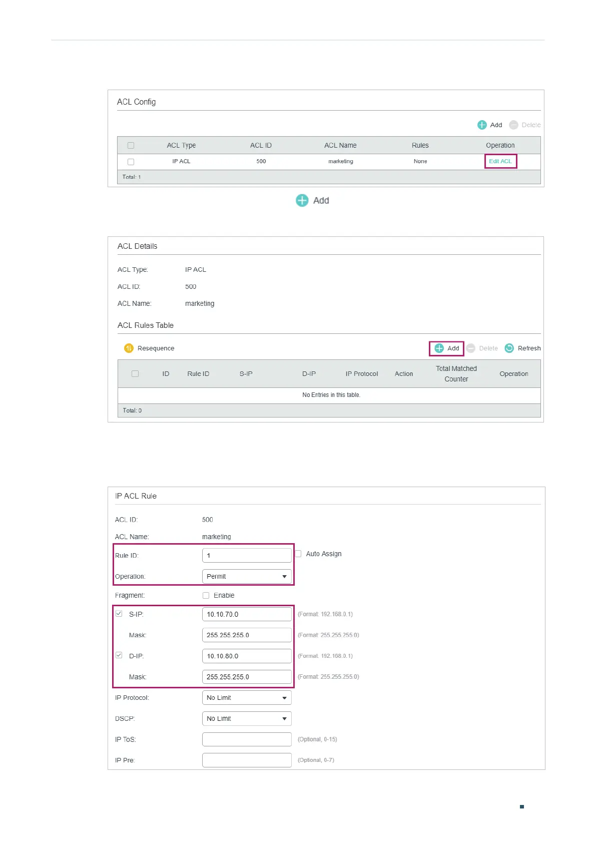 4) Configure rule 1 to permit packets with the source IP address 10.10.70.0/24 and