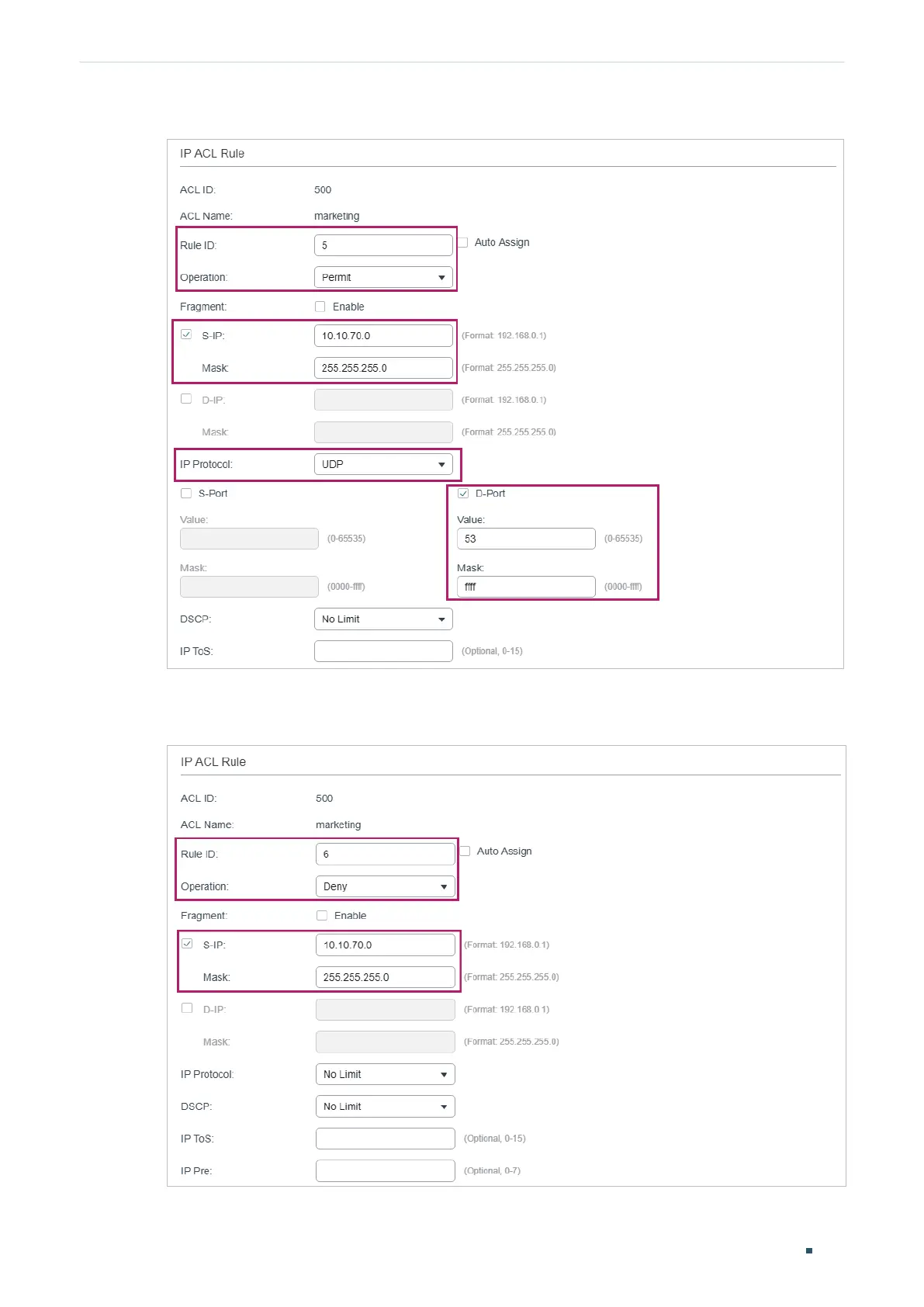 7) In the same way, configure rule 6 to deny packets with source IP 10.10.70.0.