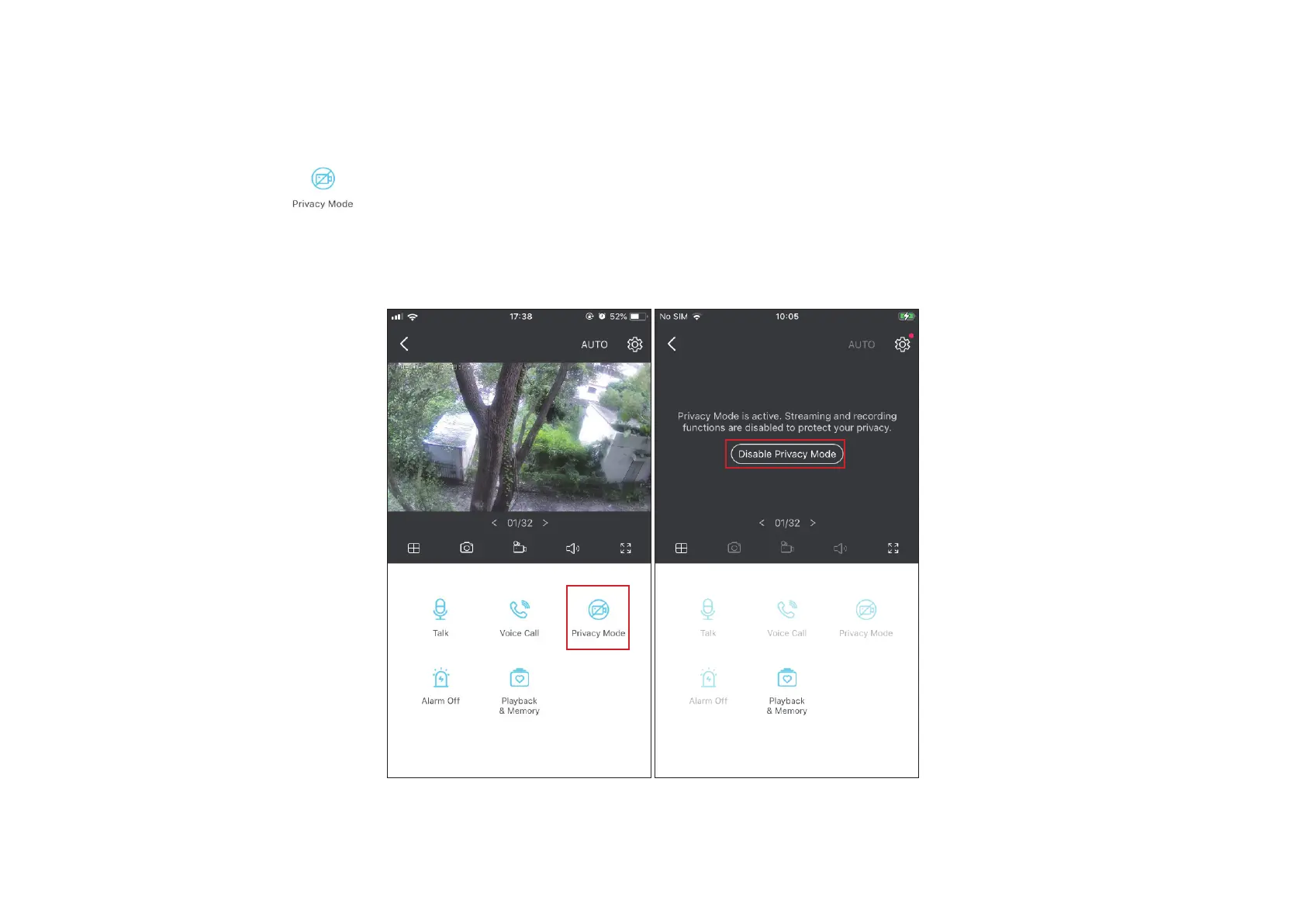 On the Live View page, tap to enable the Privacy Mode. When enabled, streaming and recording functions will be temporarily disabled to