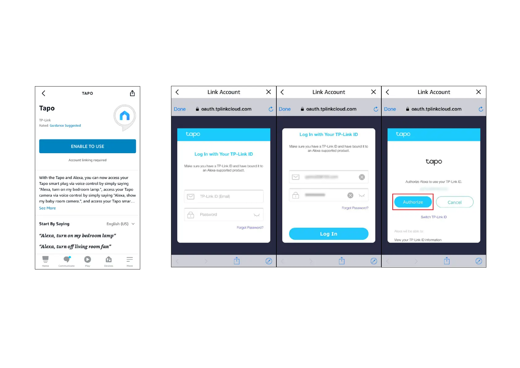 4. Log in with your TP-Link ID that has bound to your Tapo device, and tap Authorize. After authorized