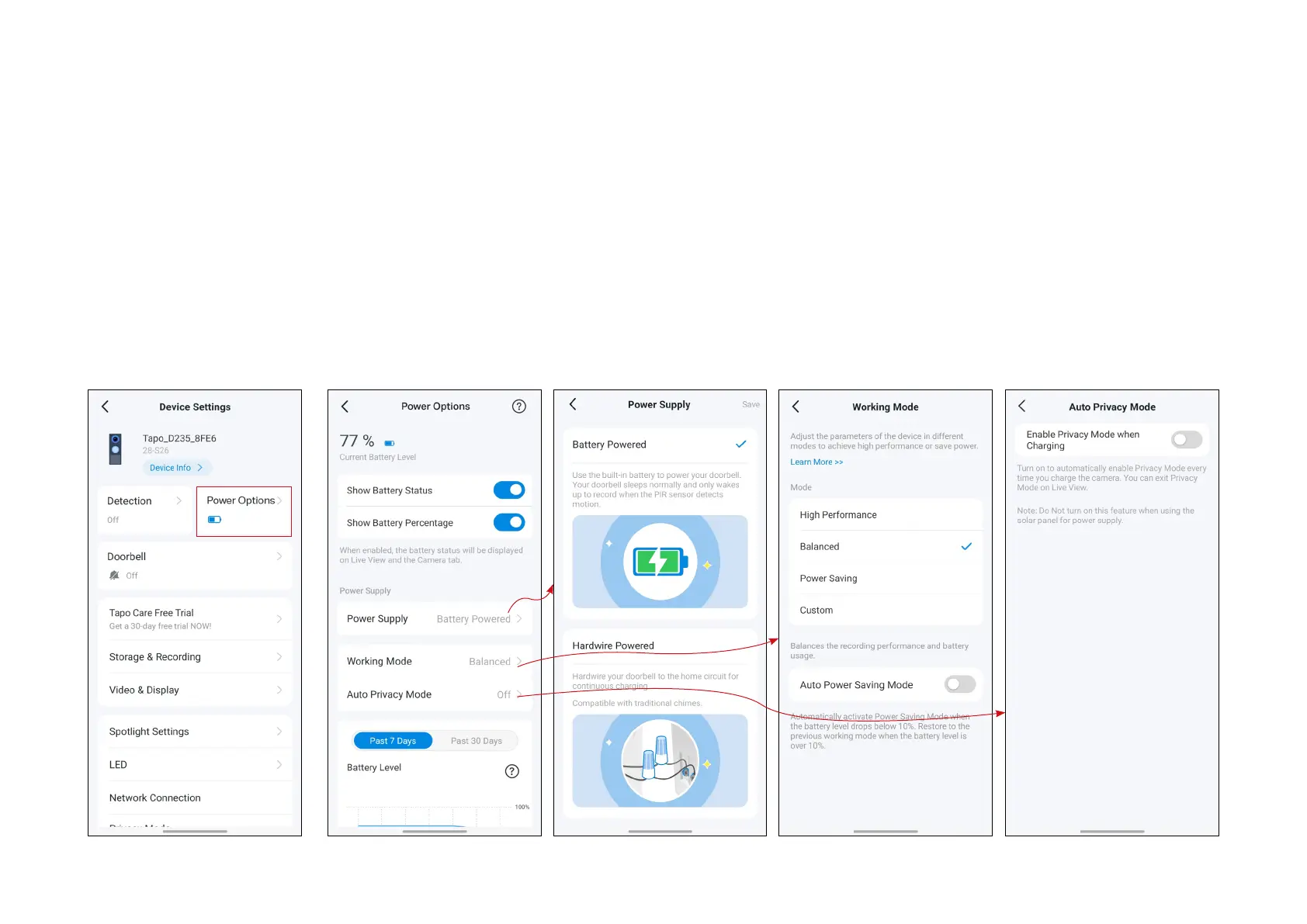 working mode and Auto Privacy Mode, and check battery usage and wake-up times for the past 7 or 30 days.