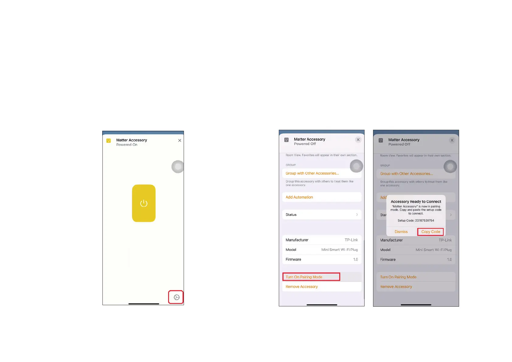 a. Launch your Home app and go to the Device Settings page. b. Scroll down, tap Turn On Pairing Mode and then Copy Code.