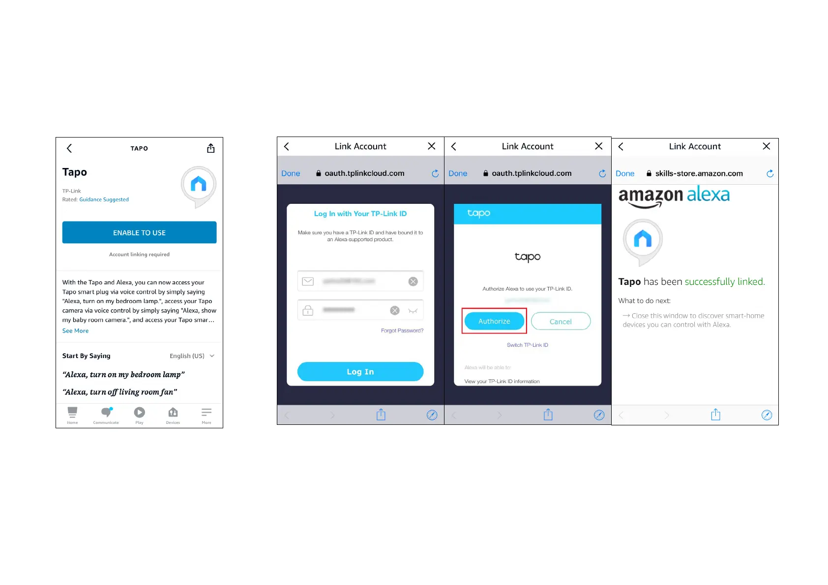 3. Tap the ENABLE TO USE button. 4. Log in with your TP-Link ID that has bound to your Tapo device, and tap Authorize. After authorized