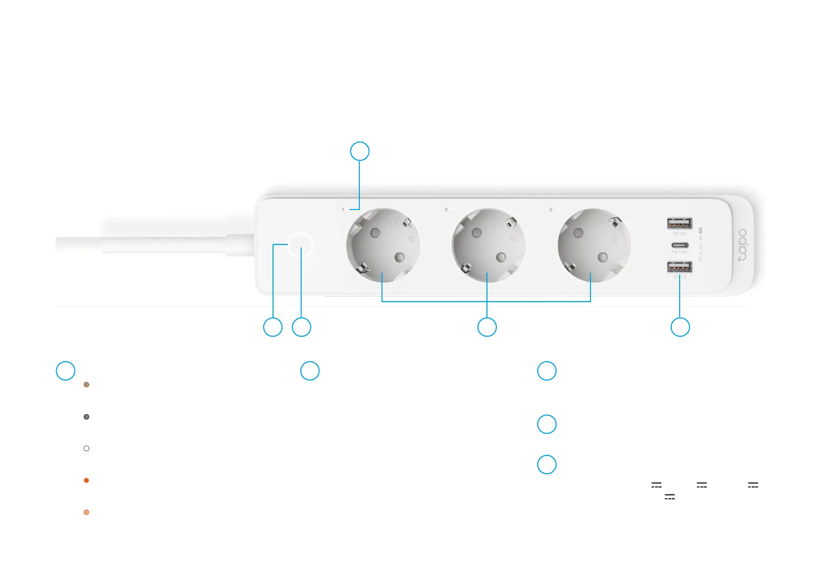 Tapo P300 Smart Wi-Fi Power Strip has one power button, three outlets, three USB ports, and three system LEDs. See the explanations below.