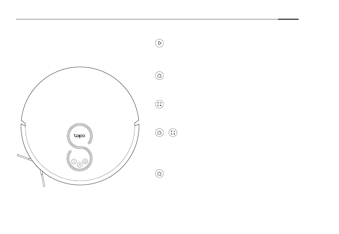 • Press and hold for 5 seconds: Turn on/off the robot vacuum.