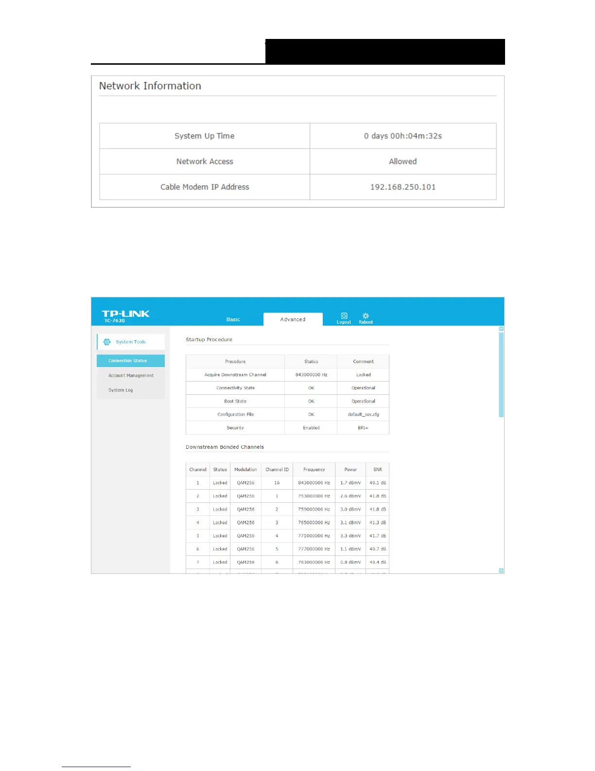 Under the Advanced menu, you can see the system tools, including the connection status,