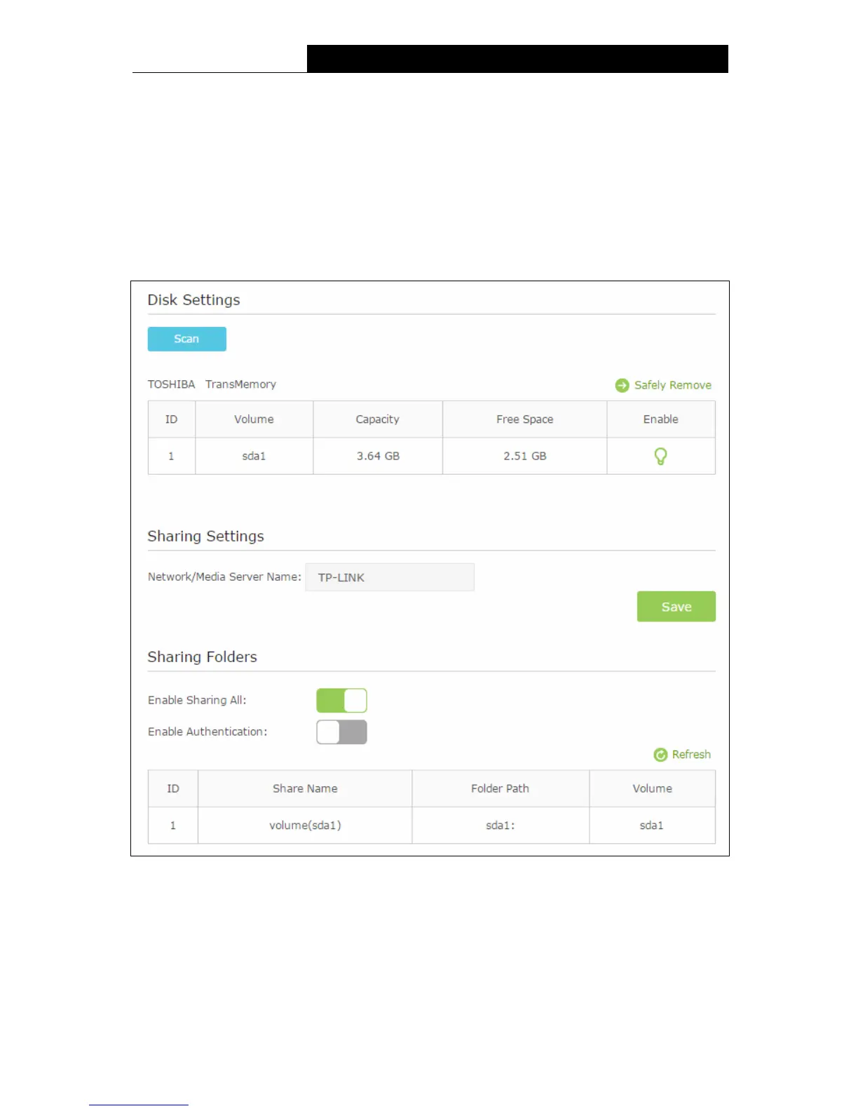 about the connected USB mass storage, and configure Sharing Folders (Media files, Document