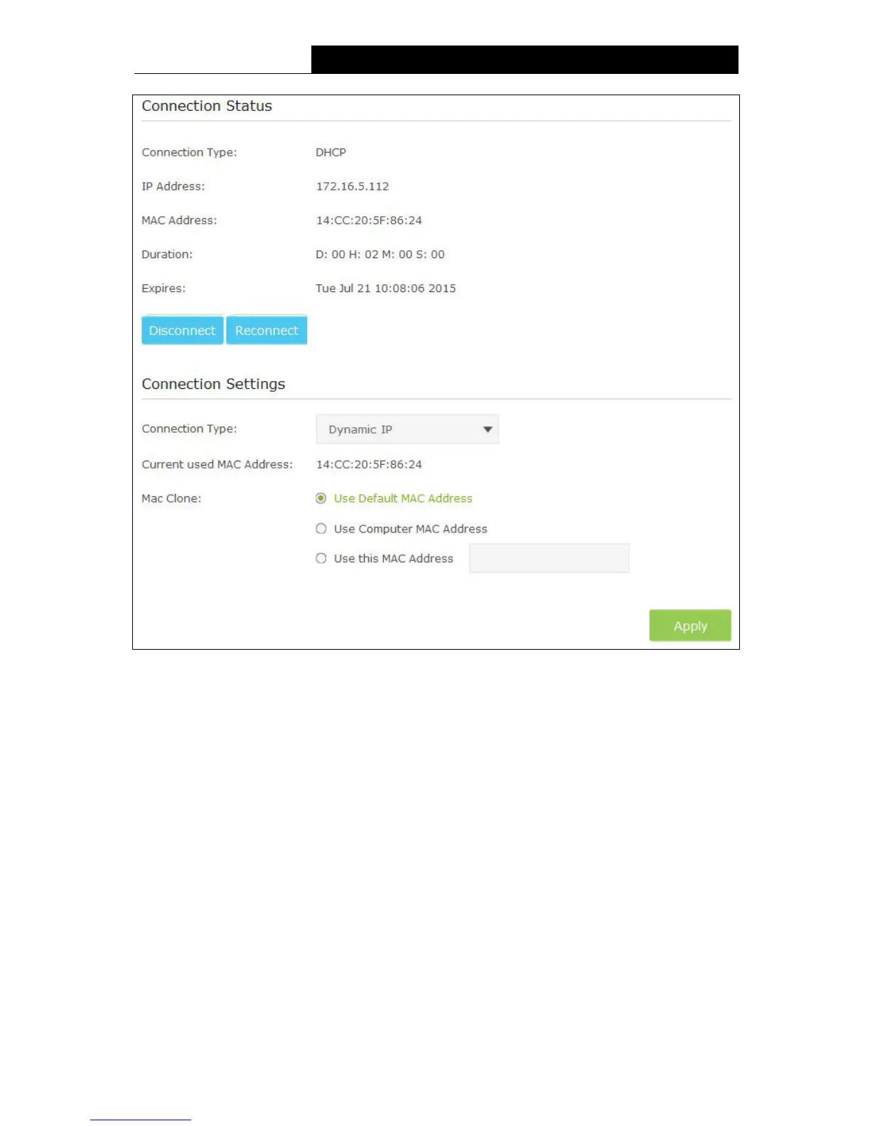 Reconnect –Click the Reconnect button to renew WAN lease.