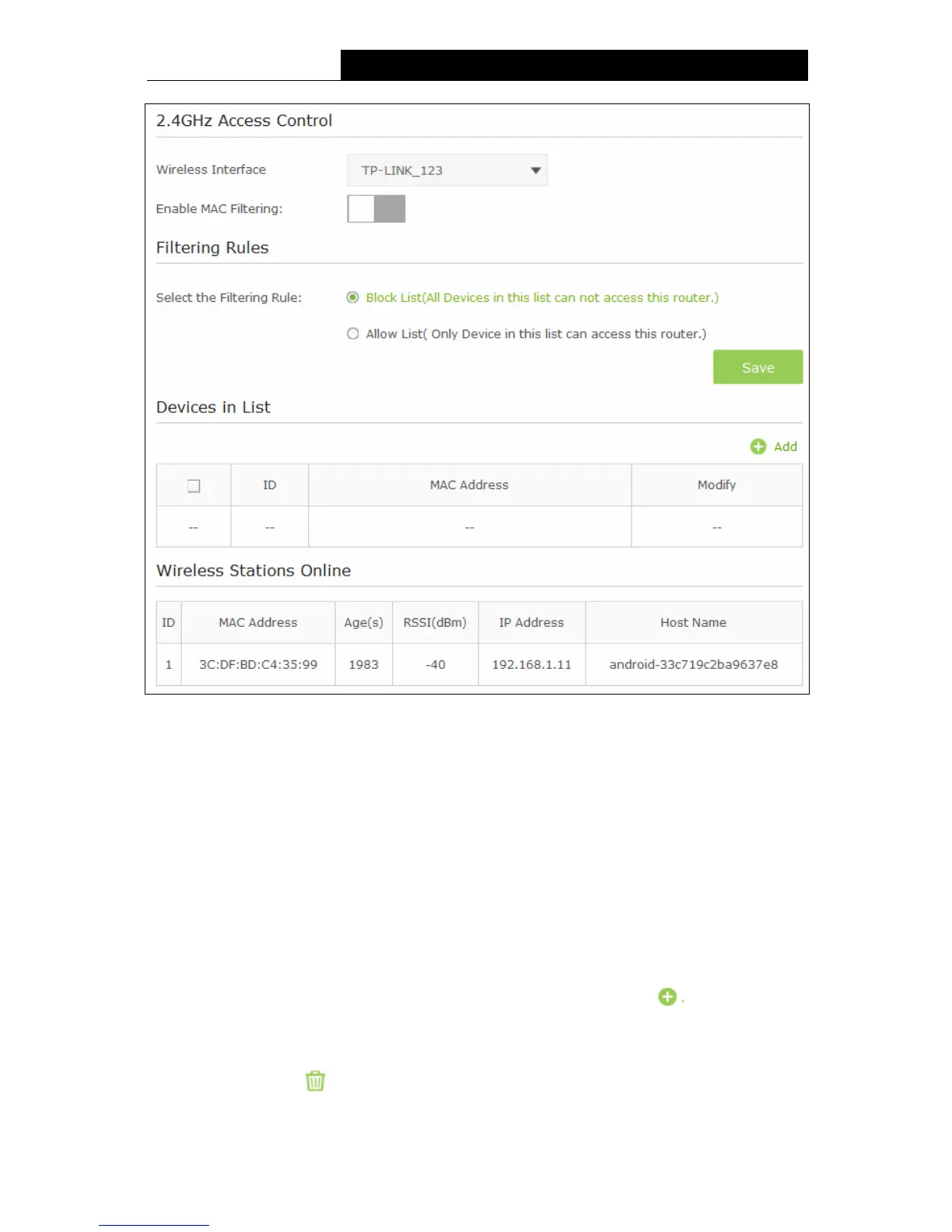 Enable MAC Filtering- The switch for the MAC Filtering. If you turn on this button, the field