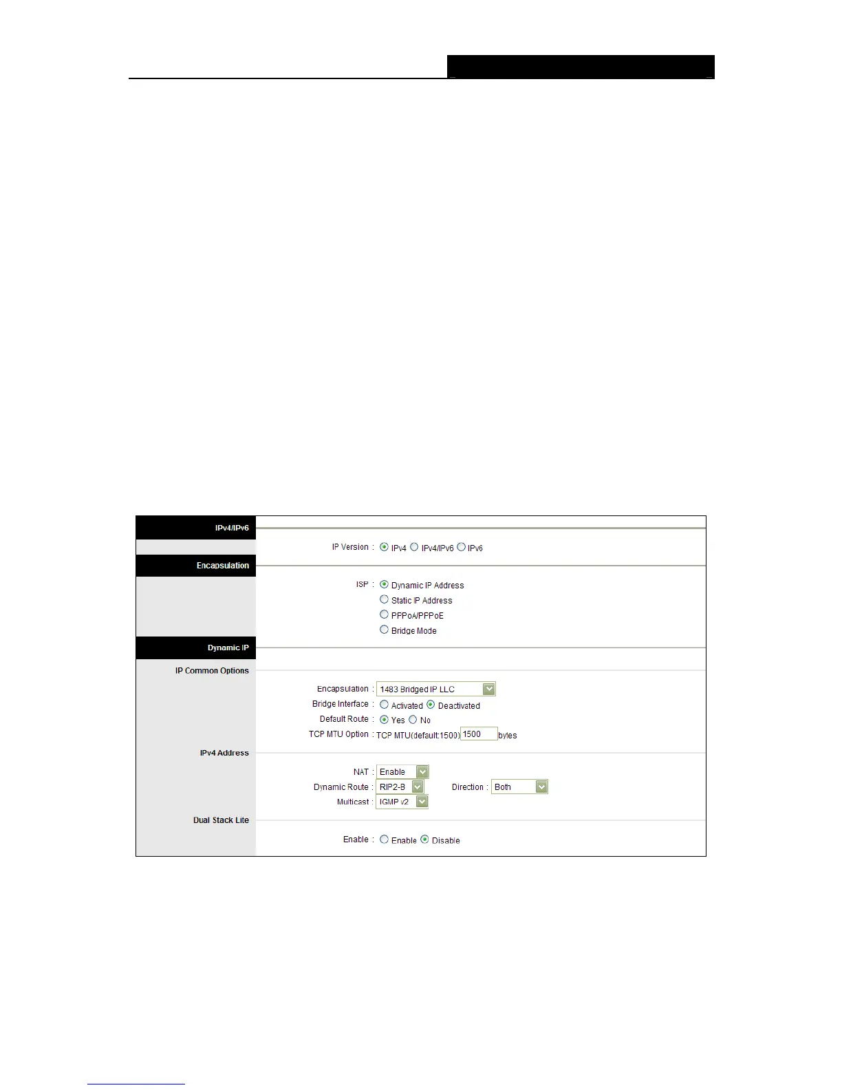 Encapsulation: Select the encapsulation mode for the Dynamic IP Address, you can leave it