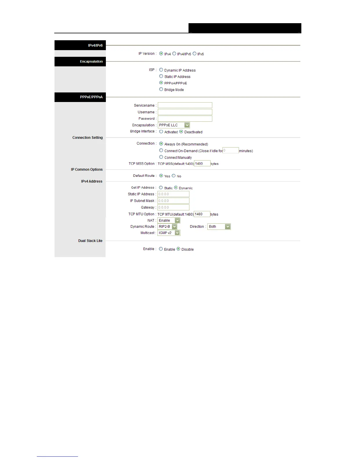 Encapsulation: For both PPPoA/PPPoE connection, you need to specify the type of