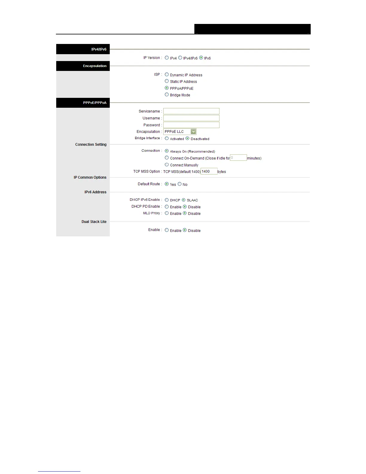 Connection: For PPPoA/PPPoE connection, you can select Always on or Connect