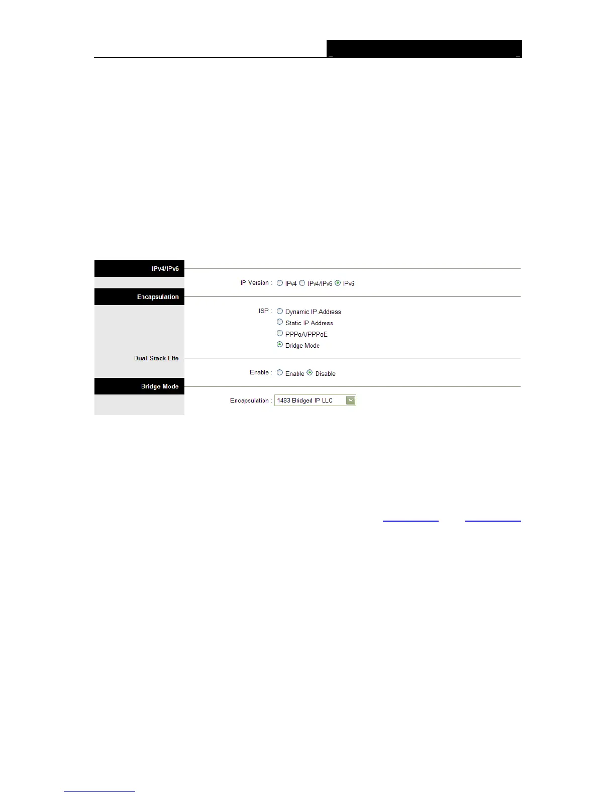 If you select this type of connection, the modem router can be configured to act as a bridging