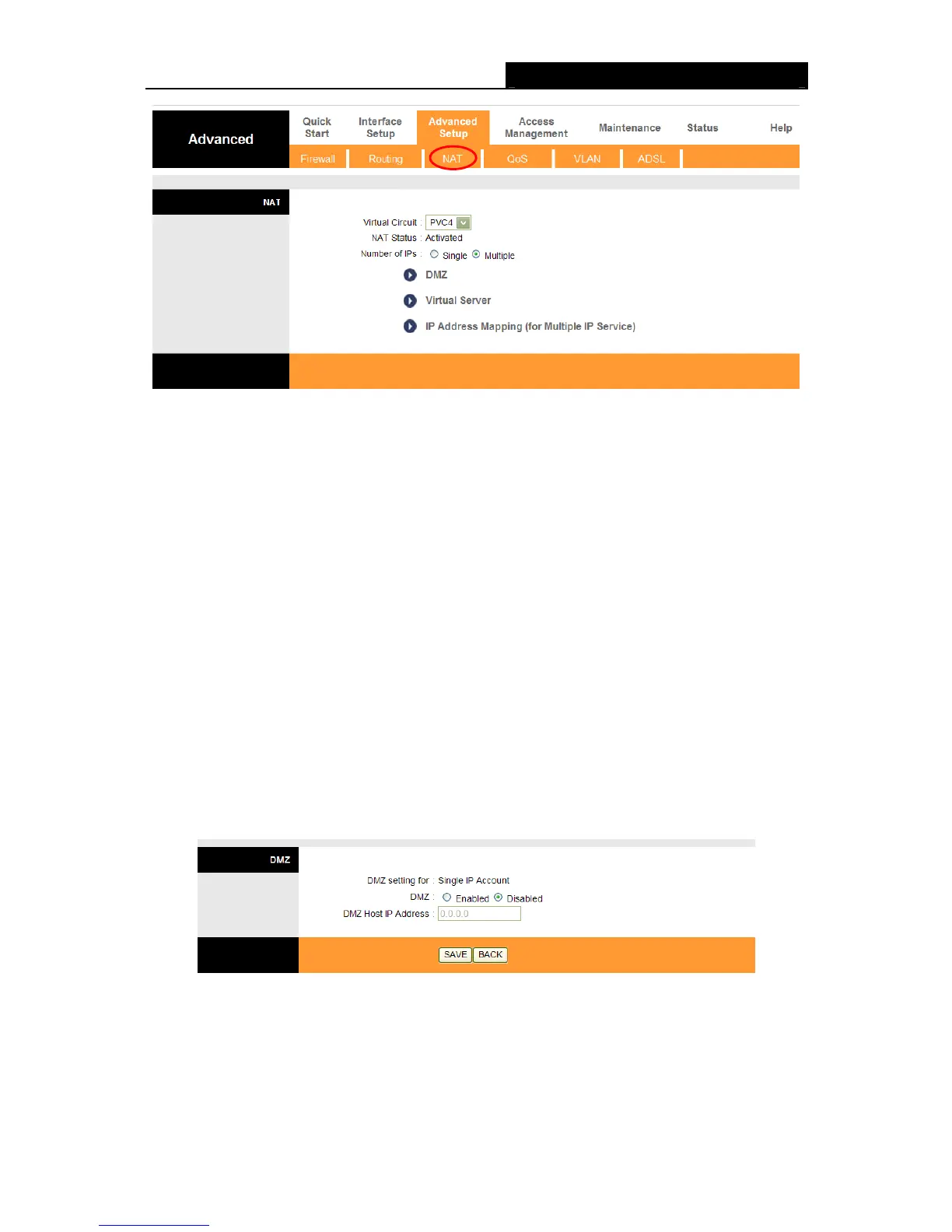 vanced Setup→NAT→DMZ” in Figure 4-22, you can configure the DMZ host in the