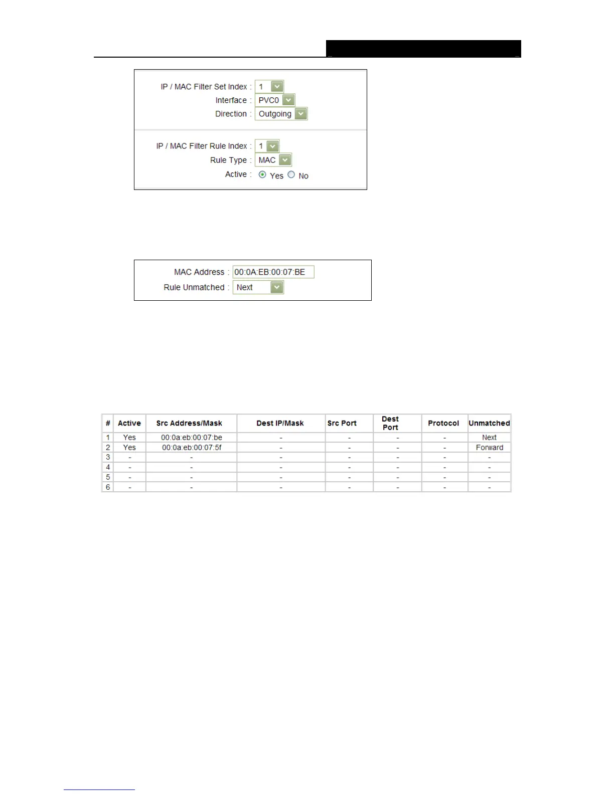 / MAC Filter Set Index and IP/MAC Filter Rule Index to view or modify the entry.