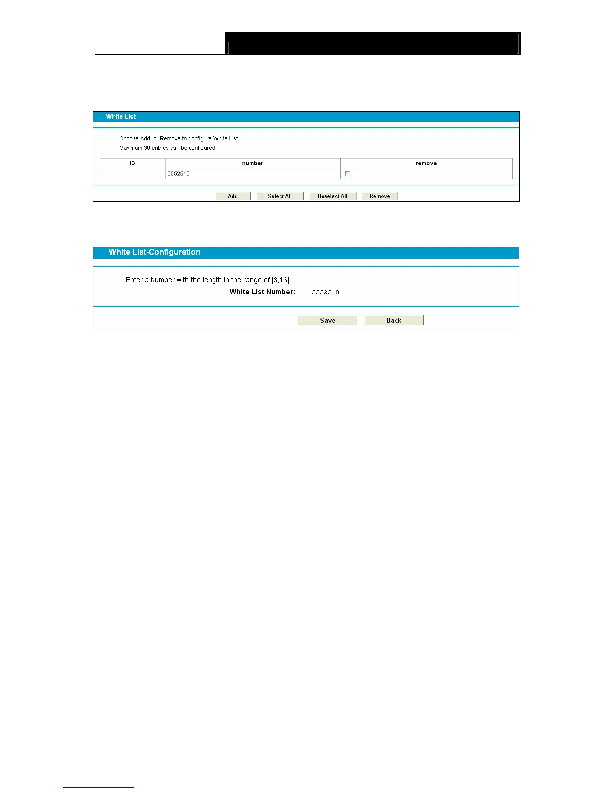 Enter a number with the length in the range of [3, 16] in the field of White List Number and click