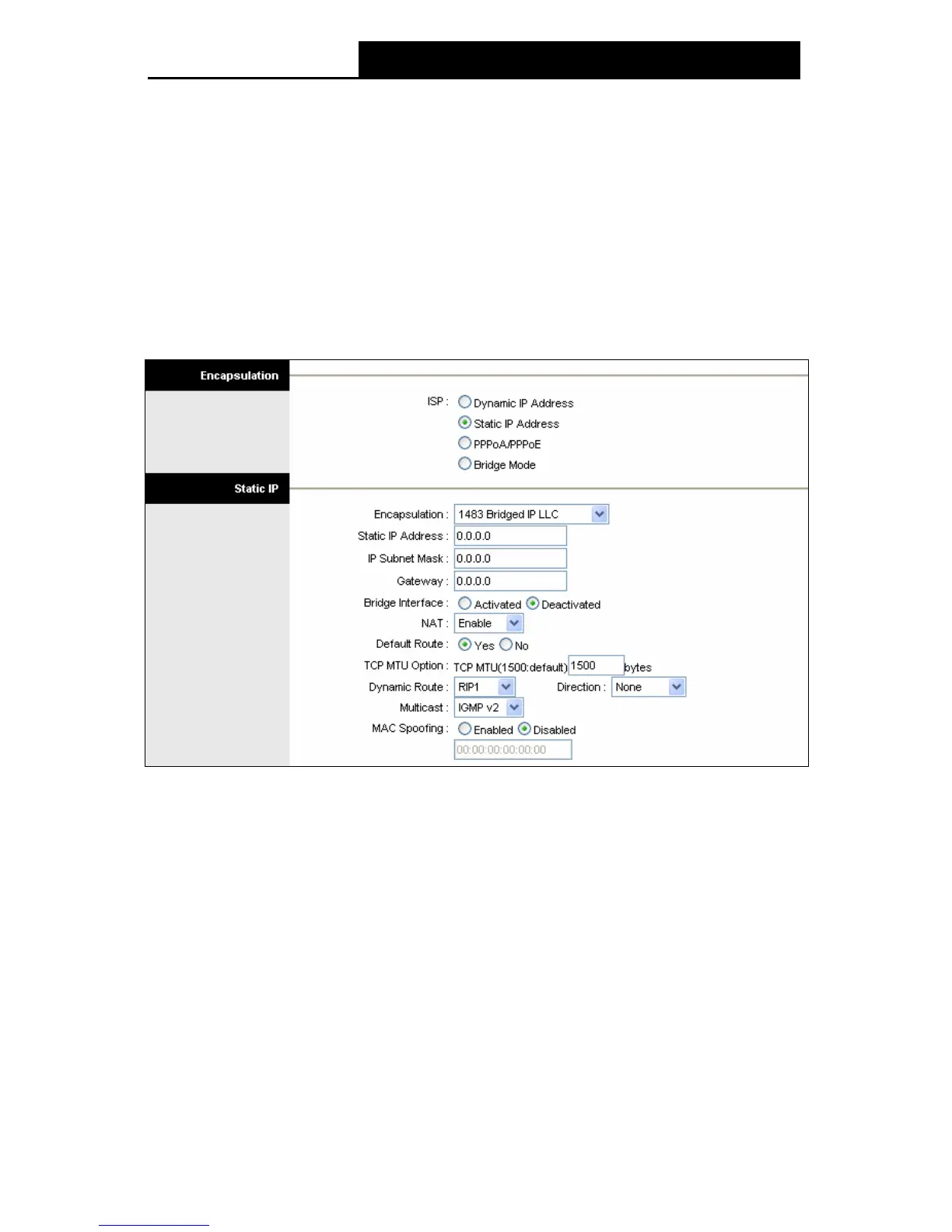 Select this option if your ISP provides static IP information to you. You should set static IP address,