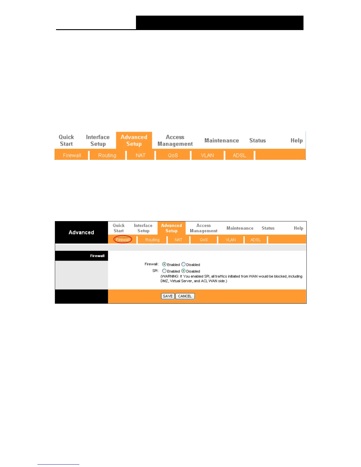 Choose “Advanced Setup→Firewall” menu, and you will see the next screen (shown in Figure
